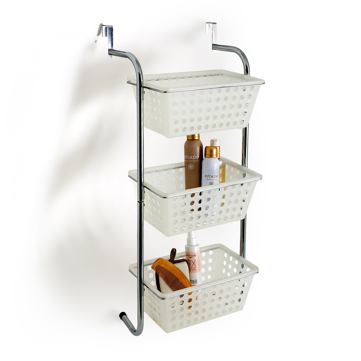 Κρεμαστή ραφιέρα από χρωμέ μέταλλο. Πρακτική, προσφέρει 3 καλάθια αποθήκευσης από πολυπροπυλένιο για την οργάνωση της κουζίνας ή του μπάνιου σας, κερδίζοντας παράλληλα χώρο στο δάπεδο.
