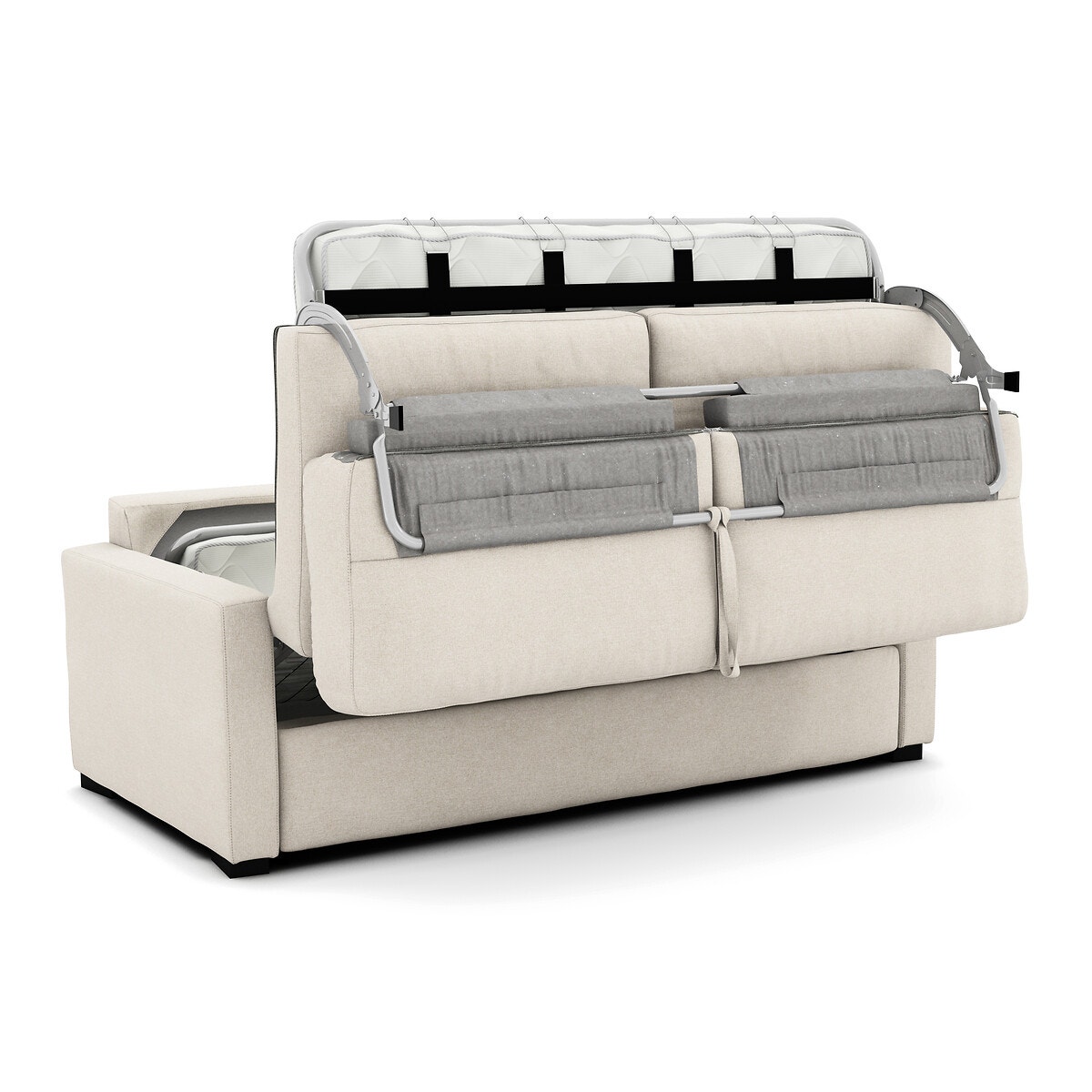 Χάρη στο σύστημα γρήγορης μετατροπής, ο καναπές-κρεβάτι ανοίγει στο άψε σβήσε (με τη βοήθεια μιας μικρής λαβής πίσω από τα μαξιλάρια πλάτης), χωρίς κόπο και χωρίς να αφαιρέσετε τα μαξιλάρια.