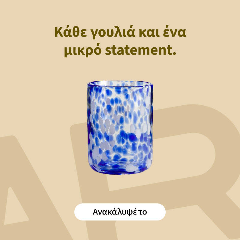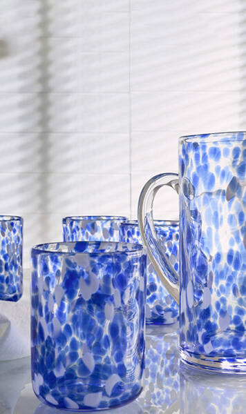 Με όψη χειροποίητου, η σειρά Dorio από γυαλί με κηλίδες δημιουργεί την απόλυτη καλοκαιρινή ατμόσφαιρα.