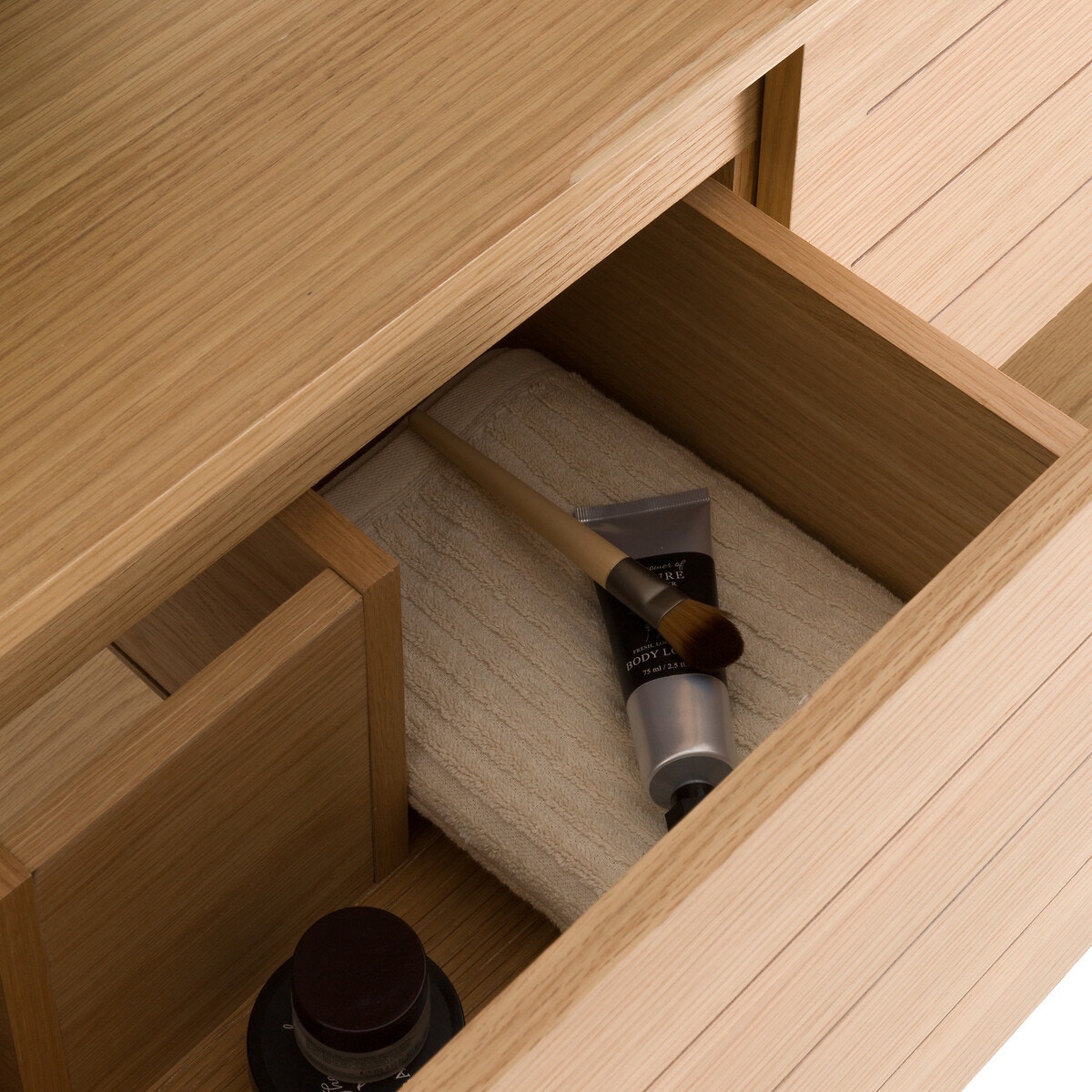 Από ξύλο ακακίας και MDF με καπλαμά ξύλου δρυ πιστοποίησης FSC®, το έπιπλο μπάνιου Niya έχει δύο πόρτες και πολλά χωρίσματα στο εσωτερικό για τις πετσέτες και τα προϊόντα ομορφιάς. Σχεδιασμένο για δύο νιπτήρες.