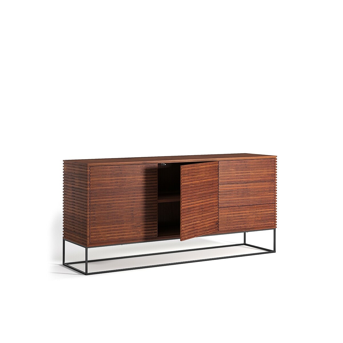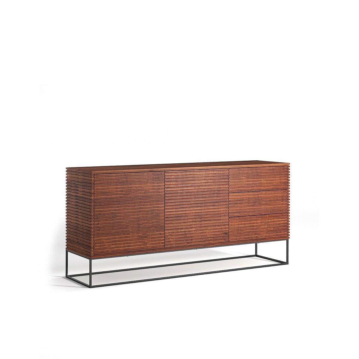 Μπουφές Pakkun. Μοντέρνα και εξεζητημένη σχεδίαση. Ένας μπουφές επικαλυμμένος με μικρές τάβλες από ξύλο παλίσανδρου Βολιβίας, με 2 πόρτες και 3 συρτάρια, που προσφέρει πολύ μεγάλο χώρο αποθήκευσης. Πολύ όμορφος, με ανάλαφρες γραμμές και ψηλά, λεπτά πόδια από μέταλλο με παλαιωμένη όψη.