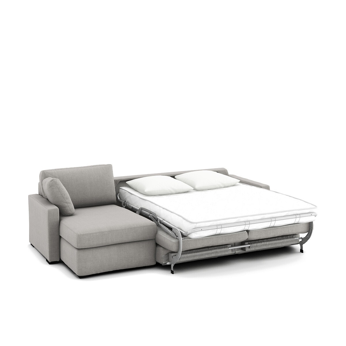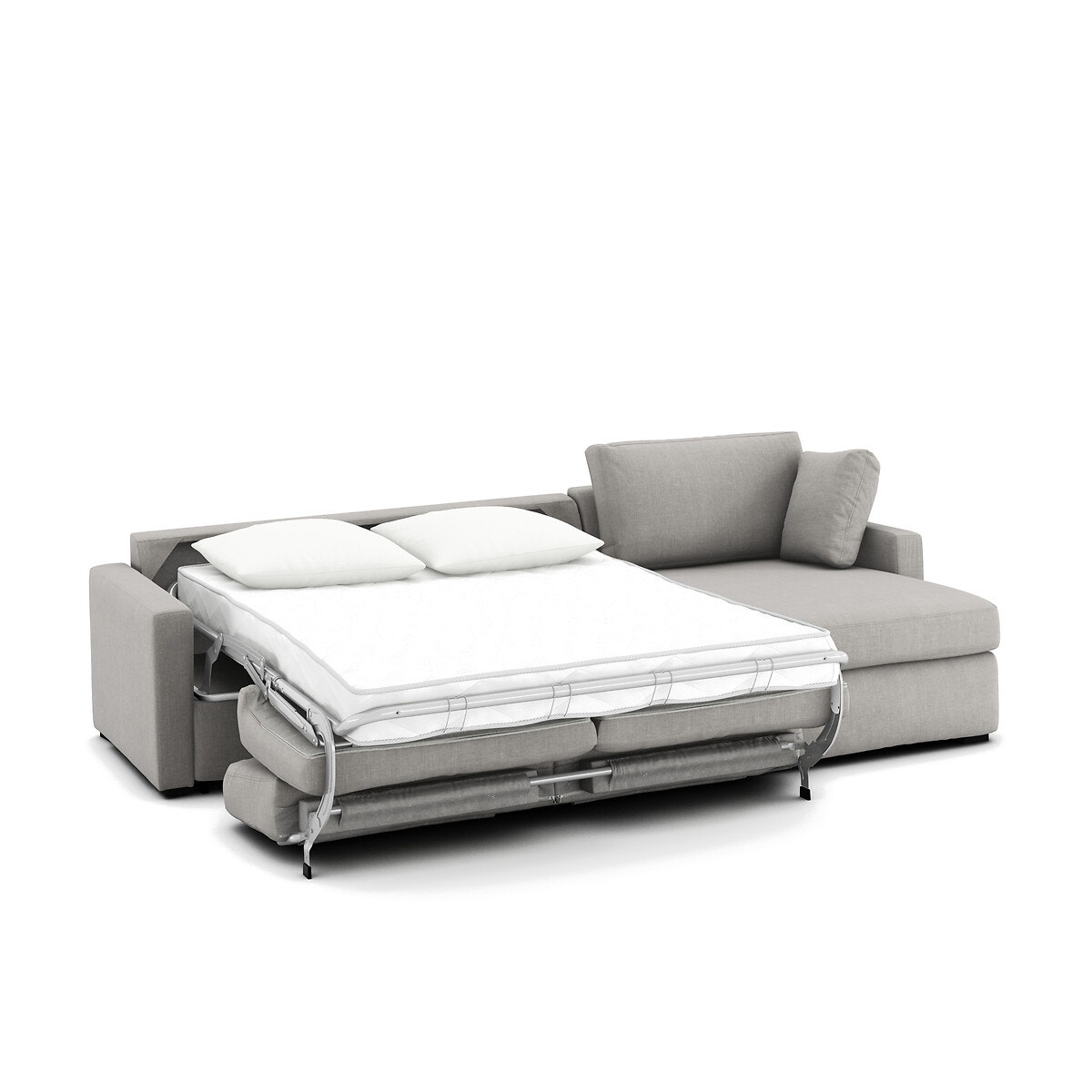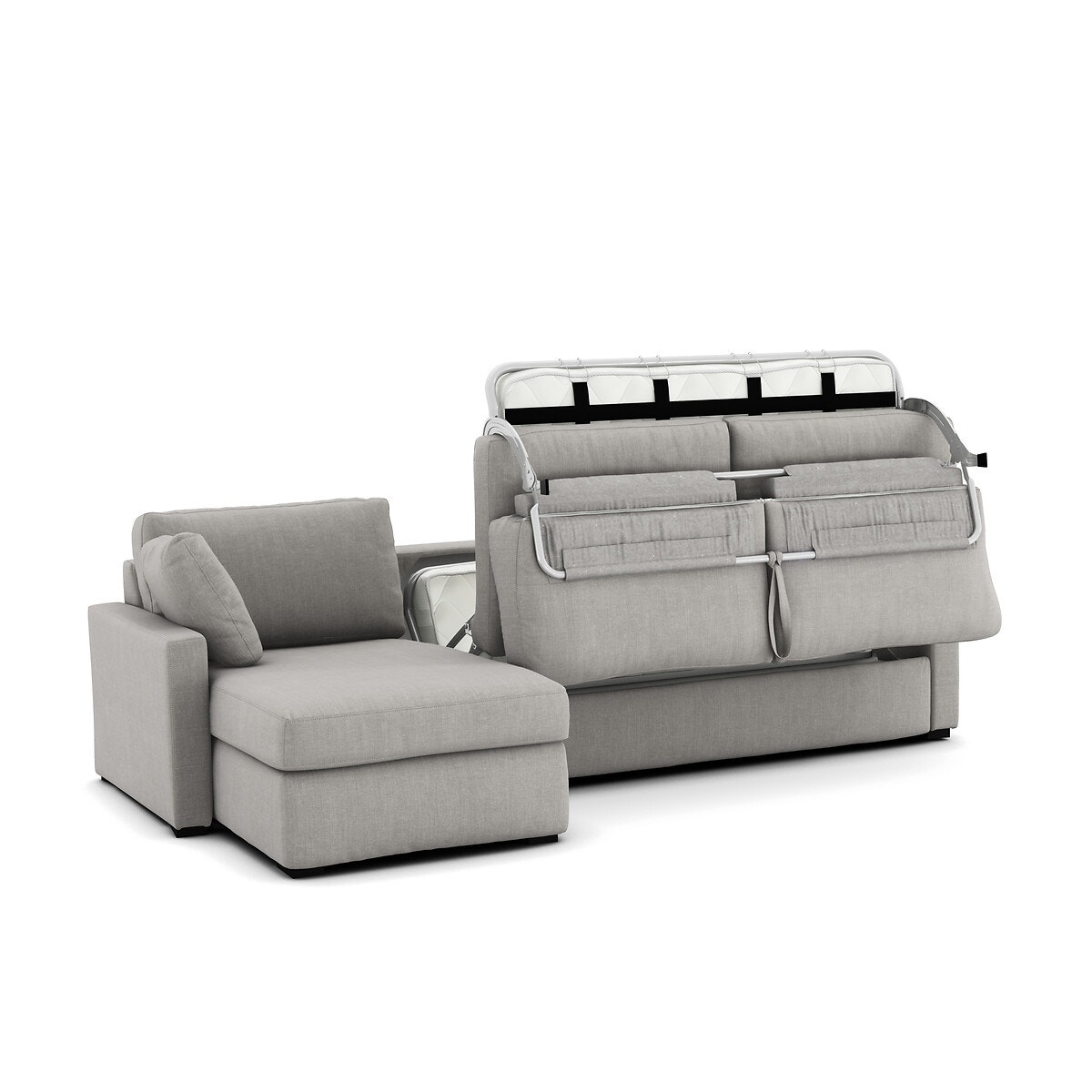 Χάρη στο σύστημα γρήγορης μετατροπής, ο γωνιακός καναπές-κρεβάτι ανοίγει στο άψε σβήσε (με τη βοήθεια μιας μικρής λαβής πίσω από τα μαξιλάρια πλάτης), χωρίς κόπο και χωρίς να αφαιρέσετε τα μαξιλάρια.