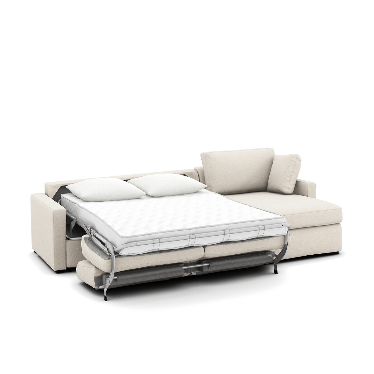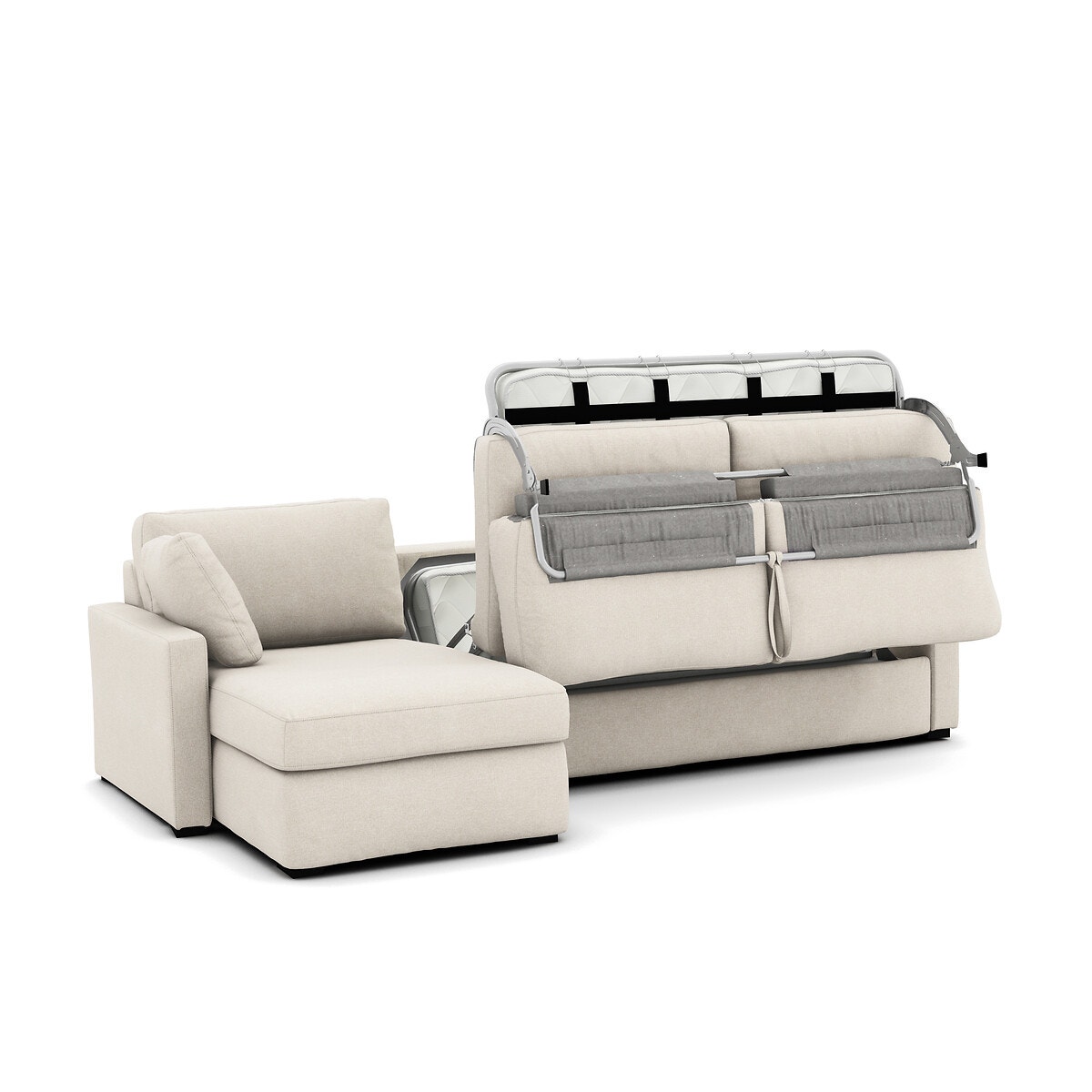 Χάρη στο σύστημα γρήγορης μετατροπής, ο γωνιακός καναπές-κρεβάτι ανοίγει στο άψε σβήσε (με τη βοήθεια μιας μικρής λαβής πίσω από τα μαξιλάρια πλάτης), χωρίς κόπο και χωρίς να αφαιρέσετε τα μαξιλάρια.