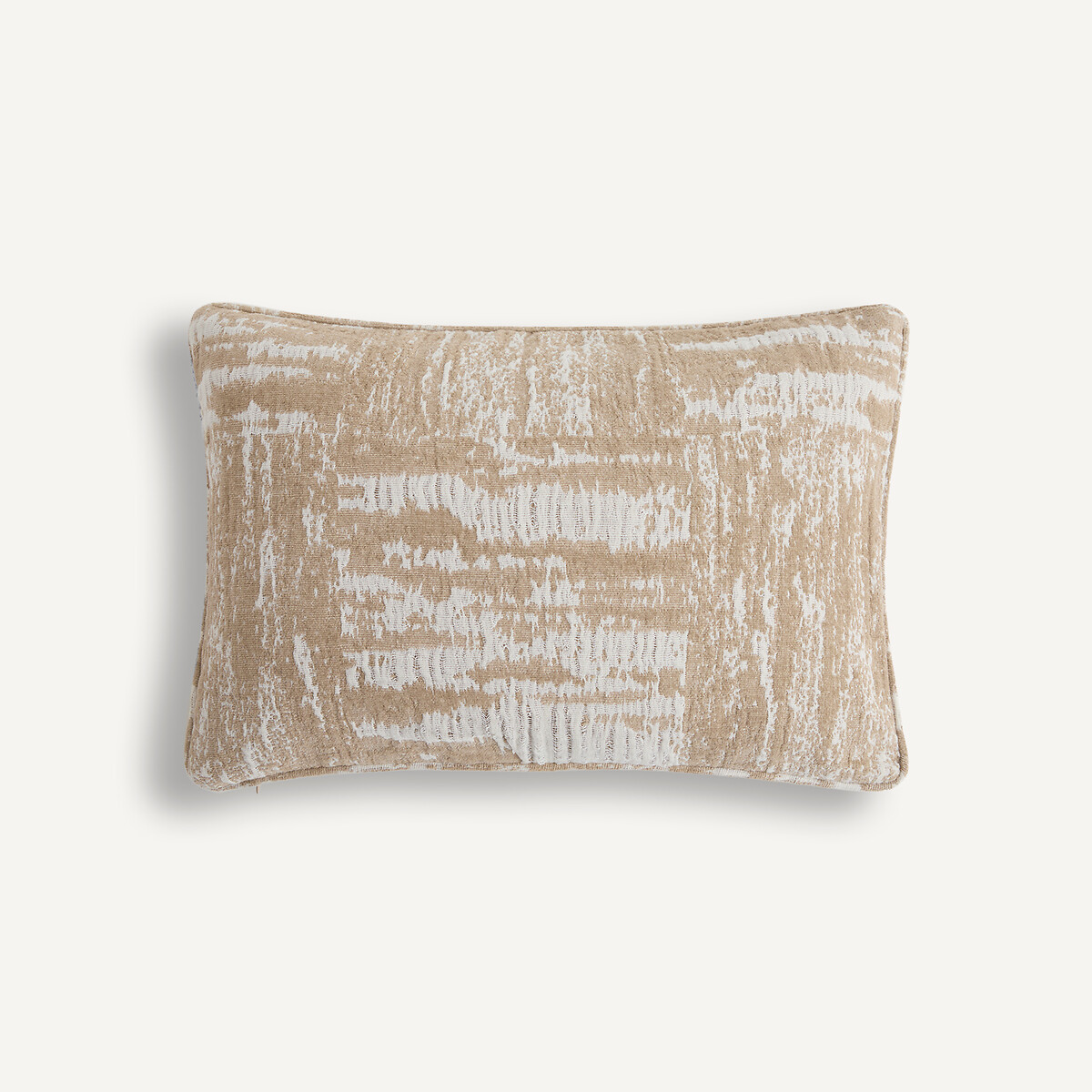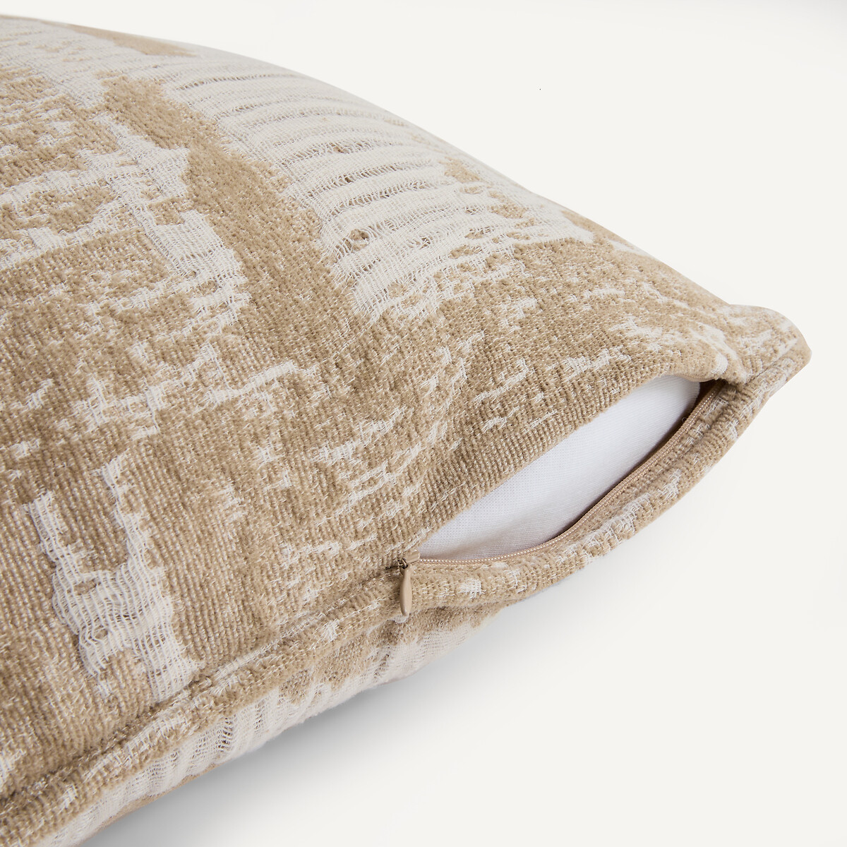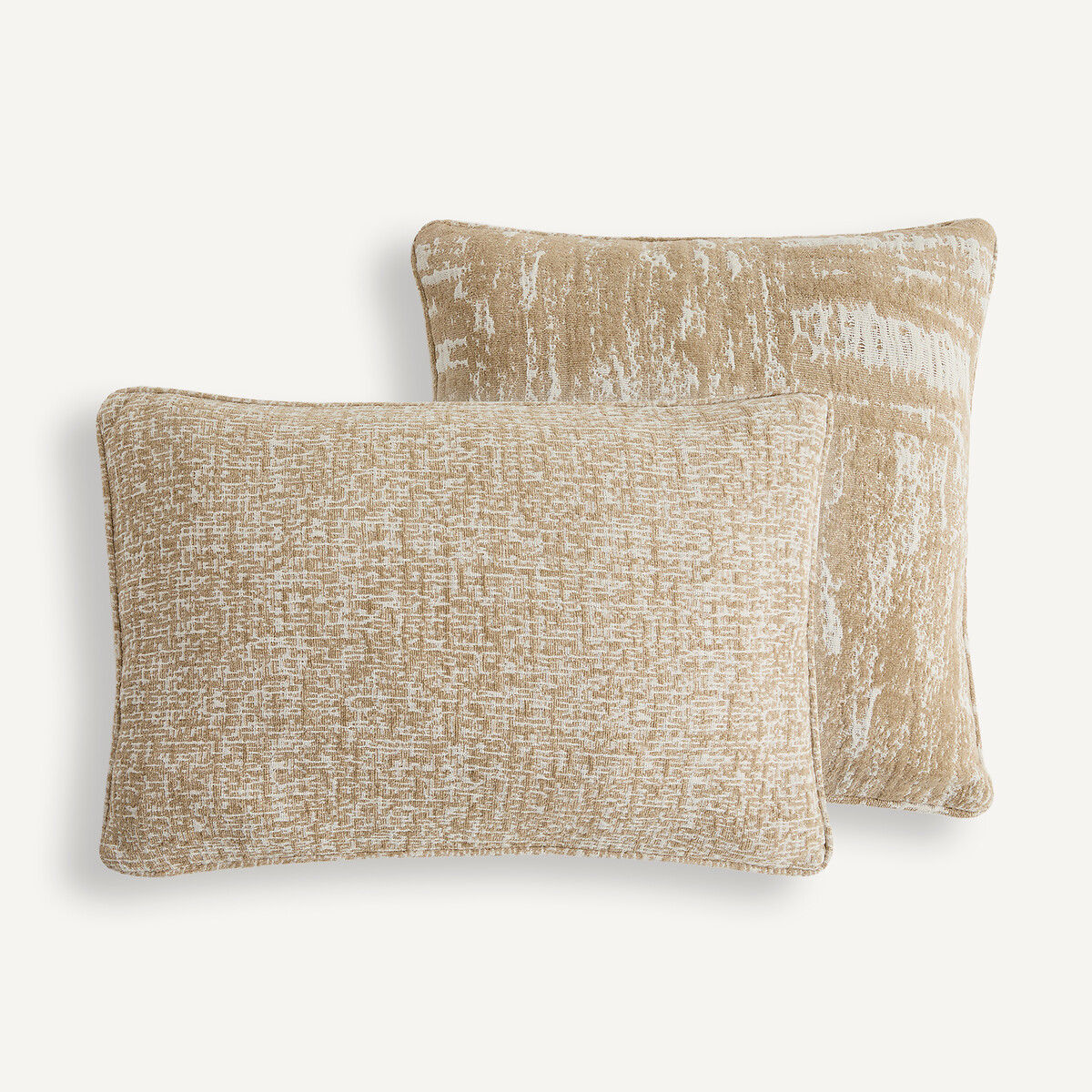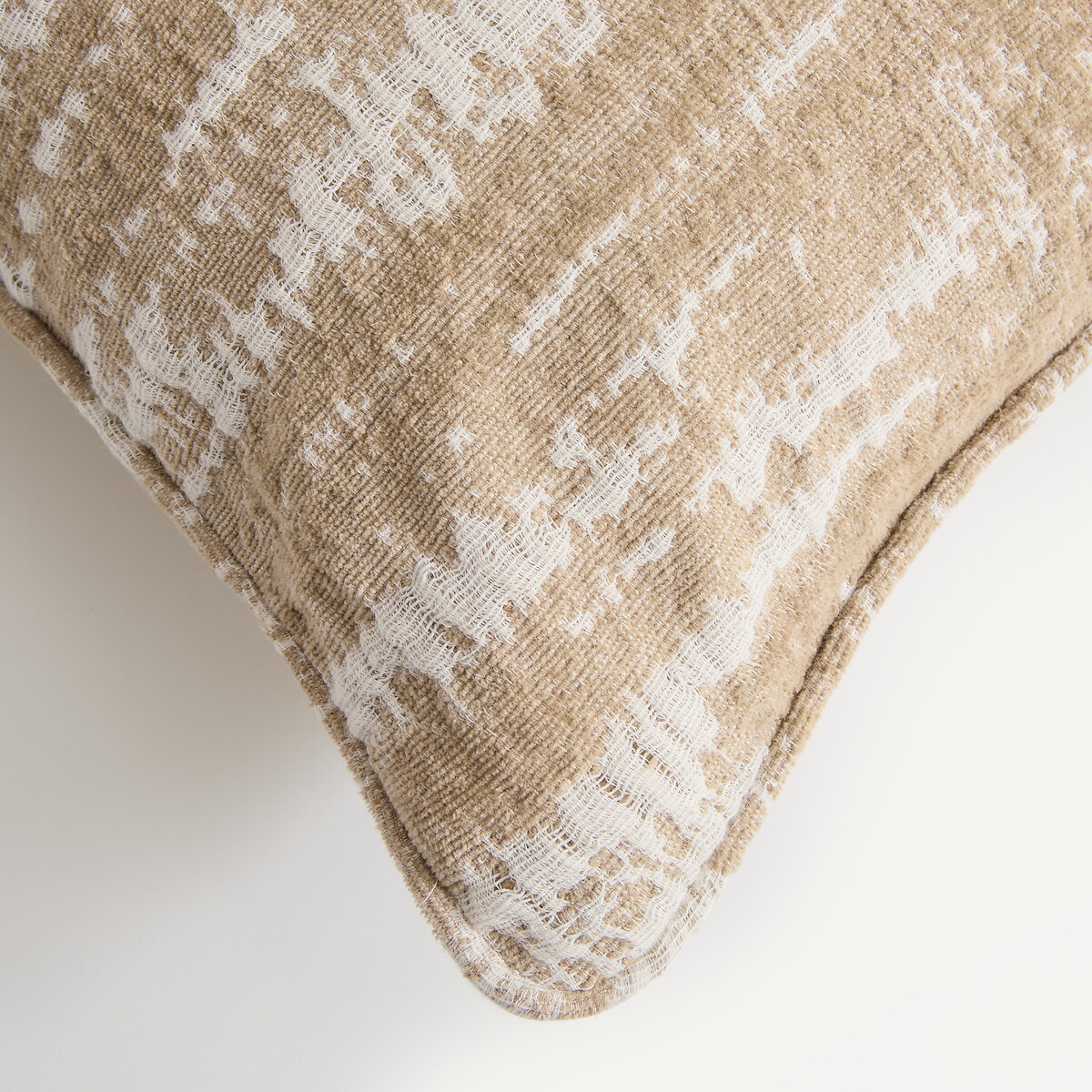 Το ύφασμα ζακάρ chenille αποκαλύπτει ένα διακριτικό παιχνίδι υλικών και προσφέρει πλούσια υφή με απαλή αίσθηση στην αφή. Μια μαξιλαροθήκη από βαμβάκι και βισκόζη που συνδυάζει αρμονικά τη μοντέρνα αισθητική με την απαλότητα των φυσικών τόνων.