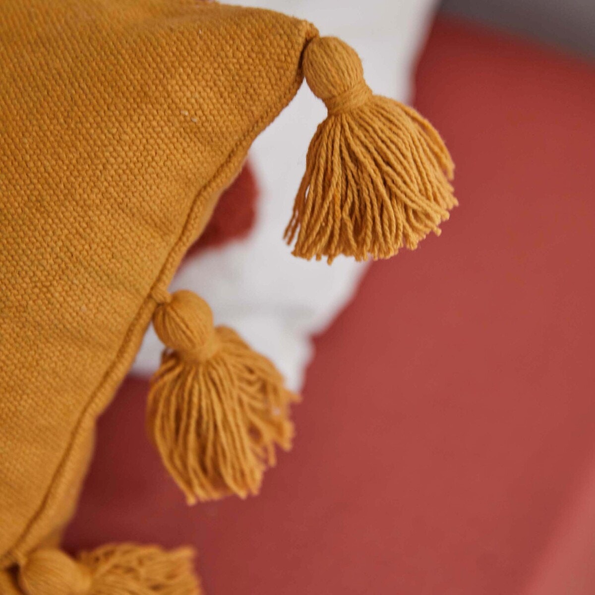 Ζεστά χρώματα, μεγάλες φουντίτσες... Η σειρά Odun δημιουργεί μποέμ ατμόσφαιρα στη διακόσμηση. Μια δημιουργία της La Redoute Intérieurs.
