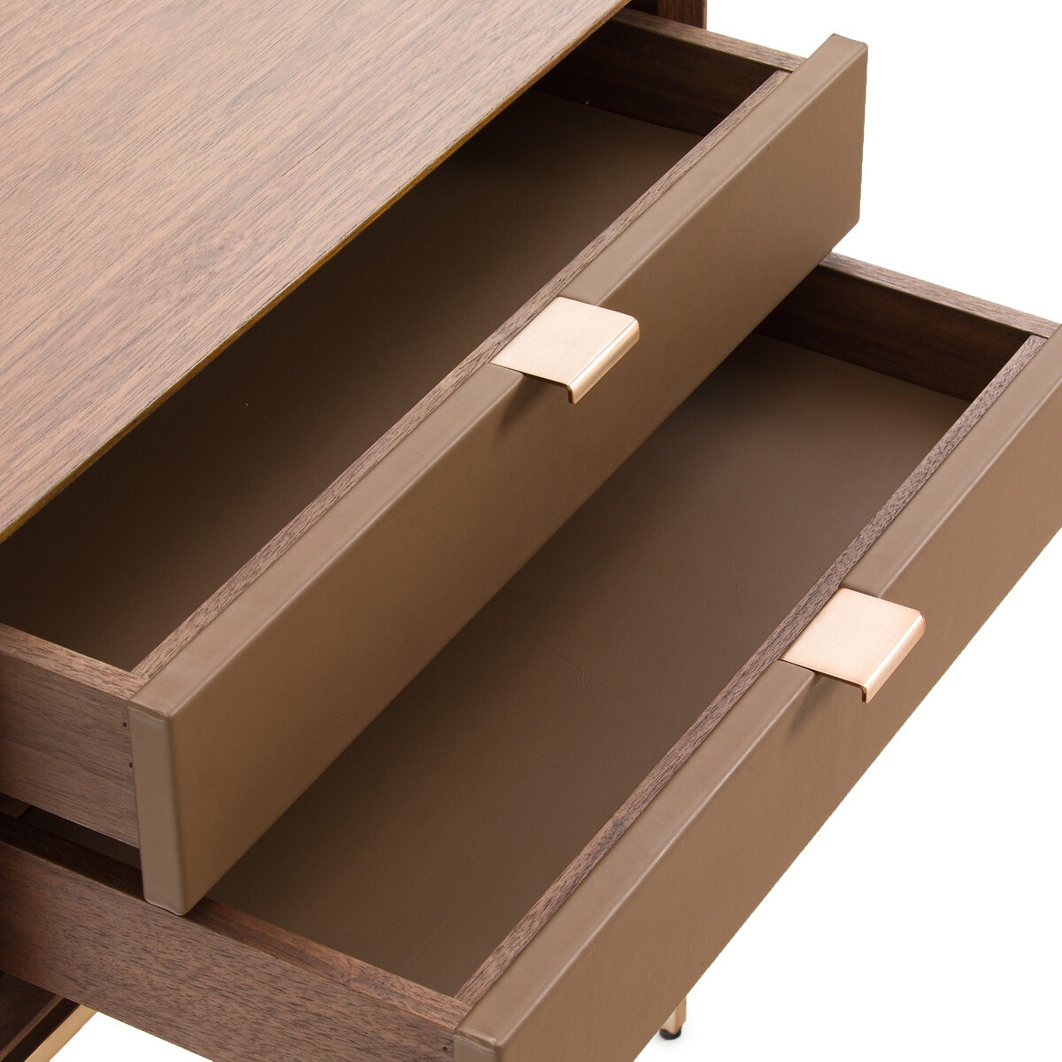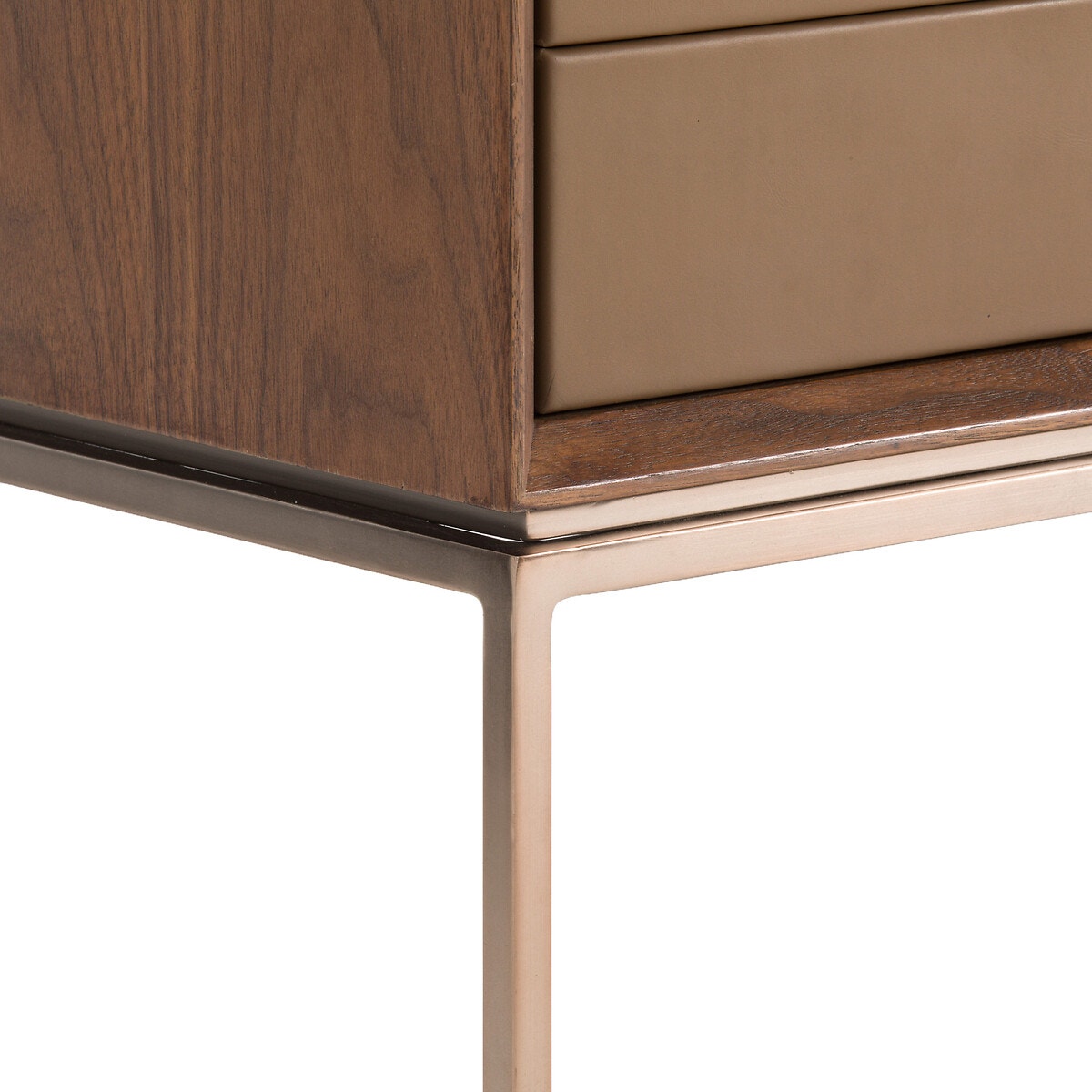 Εκλεπτυσμένο και μίνιμαλ. Αυτά τα επίθετα περιγράφουν τέλεια το κομοδίνο Delina. Μεταλλικά πόδια σε απόχρωση μόκα, πλαίσιο από ξύλο καρυδιάς και συρτάρια από γνήσιο δέρμα με σύστημα απαλού κλεισίματος.