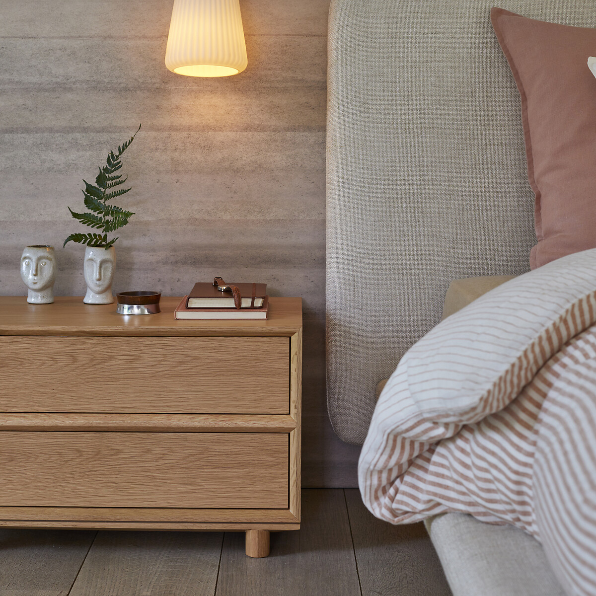 Μια δημιουργία του σχεδιαστή Emmanuel Gallina αποκλειστικά για την AM.PM. Ένα κομοδίνο με λιτό και μίνιμαλ ντιζάιν το οποίο αντισταθμίζεται από τη μοναδικότητα των πλαγιοτομών και τις μετρημένες αναλογίες του.Φτιαγμένο από ξύλο δρυ, αρκετά χαμηλό για να ενσωματώνεται διακριτικά στο χώρο, και αρκετά πλατύ ώστε να εξυπηρετεί τον σκοπό του. Δίνει μια ζεστή και μοντέρνα πινελιά στο υπνοδωμάτιο.
