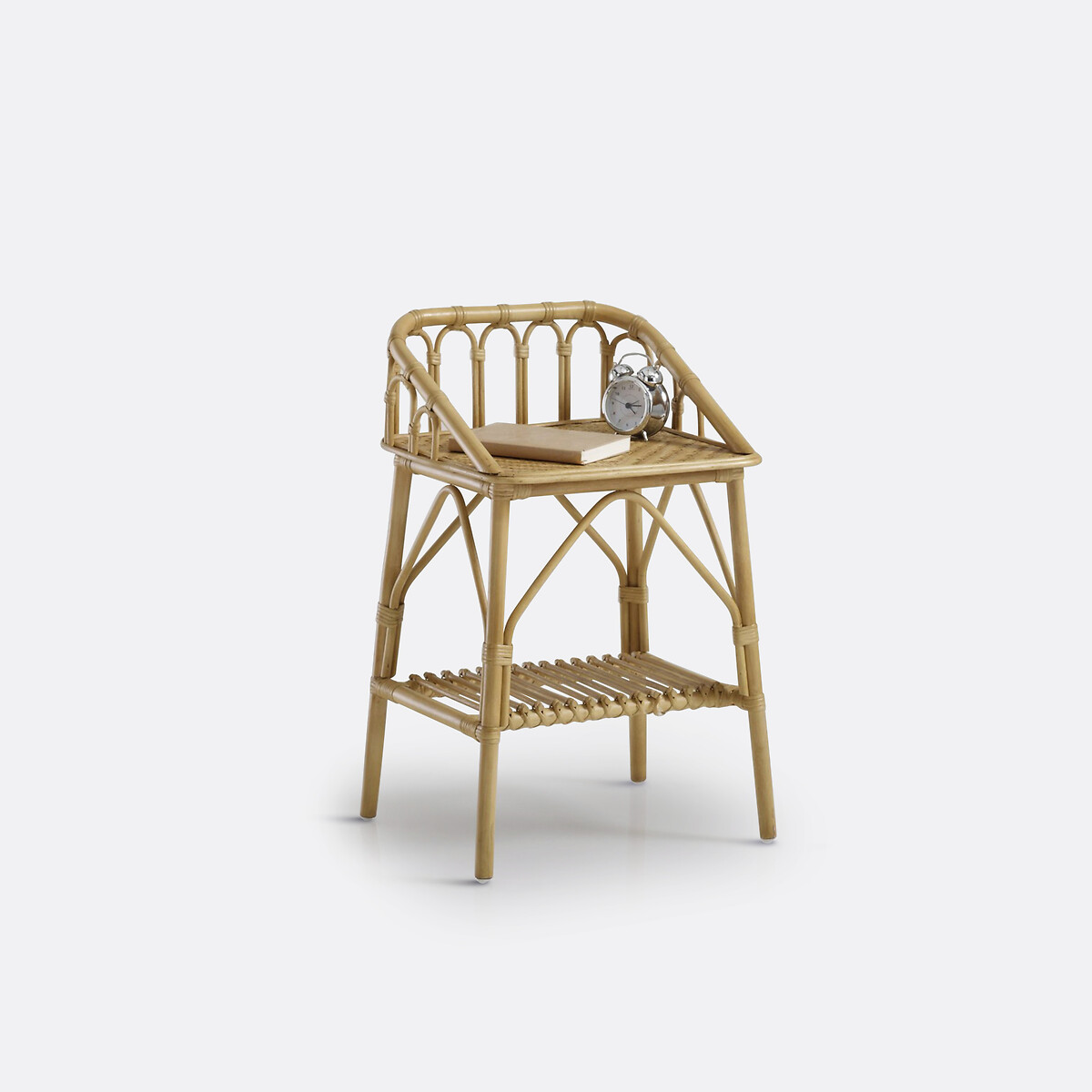 Κομοδίνο vintage από ρατάν με 2 επιφάνειες Malu. Πολύ γοητευτικό αυτό το κομοδίνο από ρατάν Malu σε φυσική απόχρωση με λουστραρισμένο φινίρισμα.