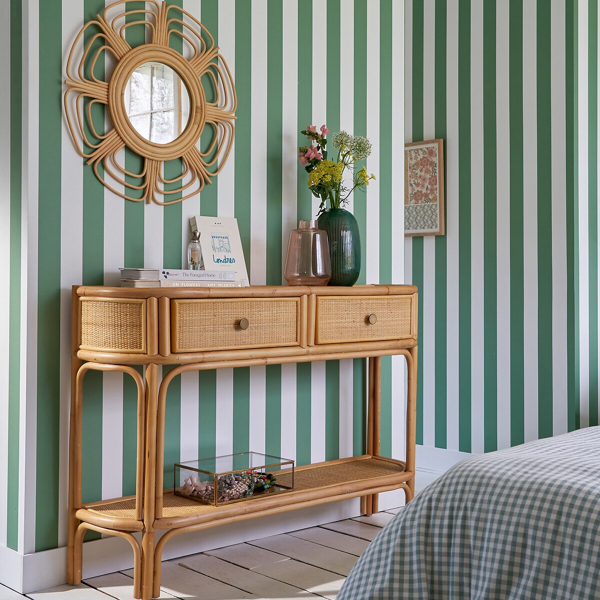 Απαλές γραμμές και προσόψεις από πλεγμένο ρατάν με μποέμ στυλ... η κονσόλα Ladara έχει δύο συρτάρια και ένα ράφι για να τακτοποιείτε όλα όσα χρειάζεστε. Μια δημιουργία της La Redoute Interieurs.