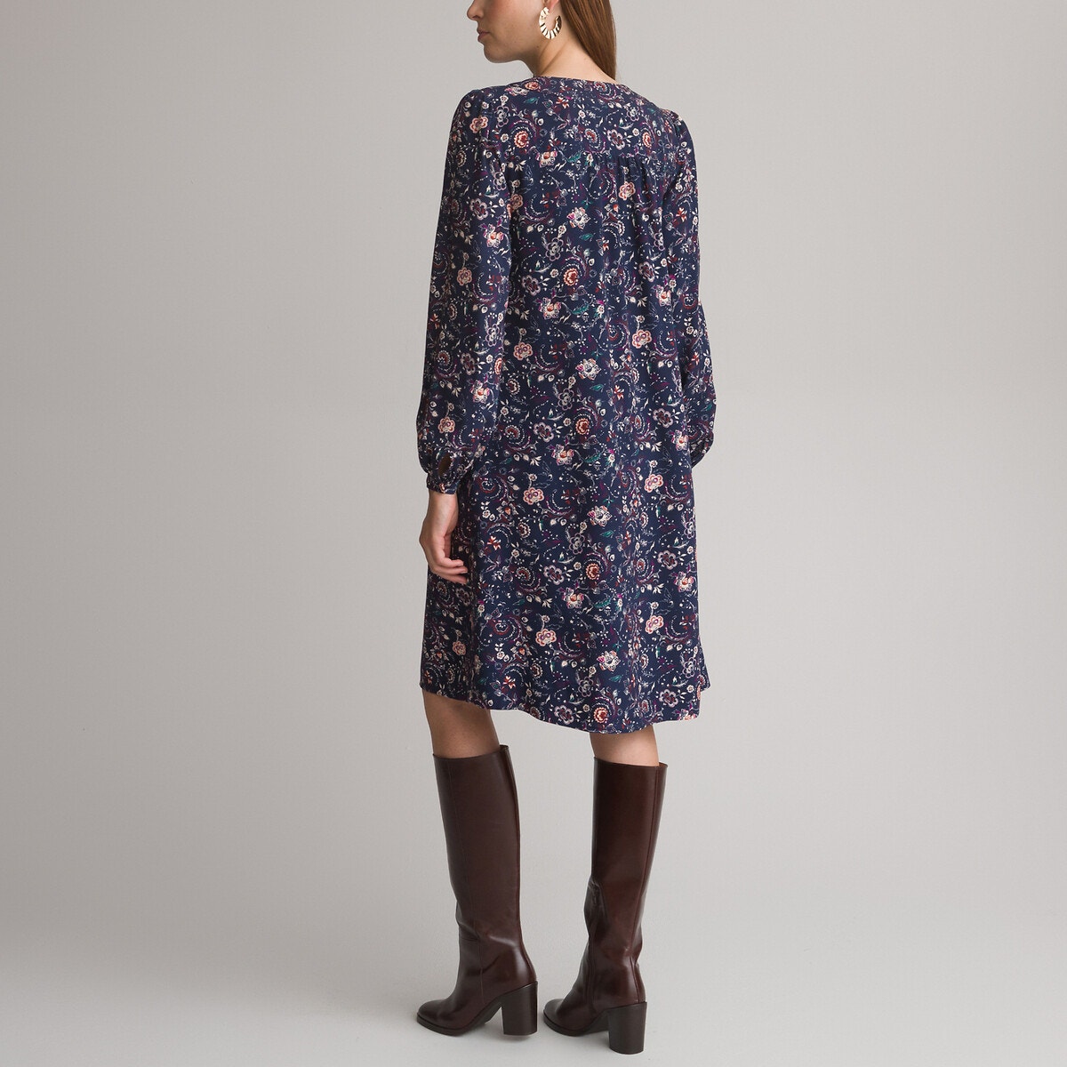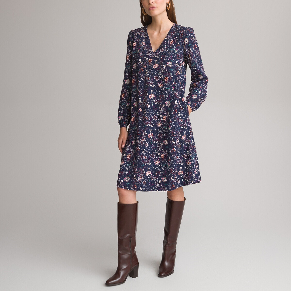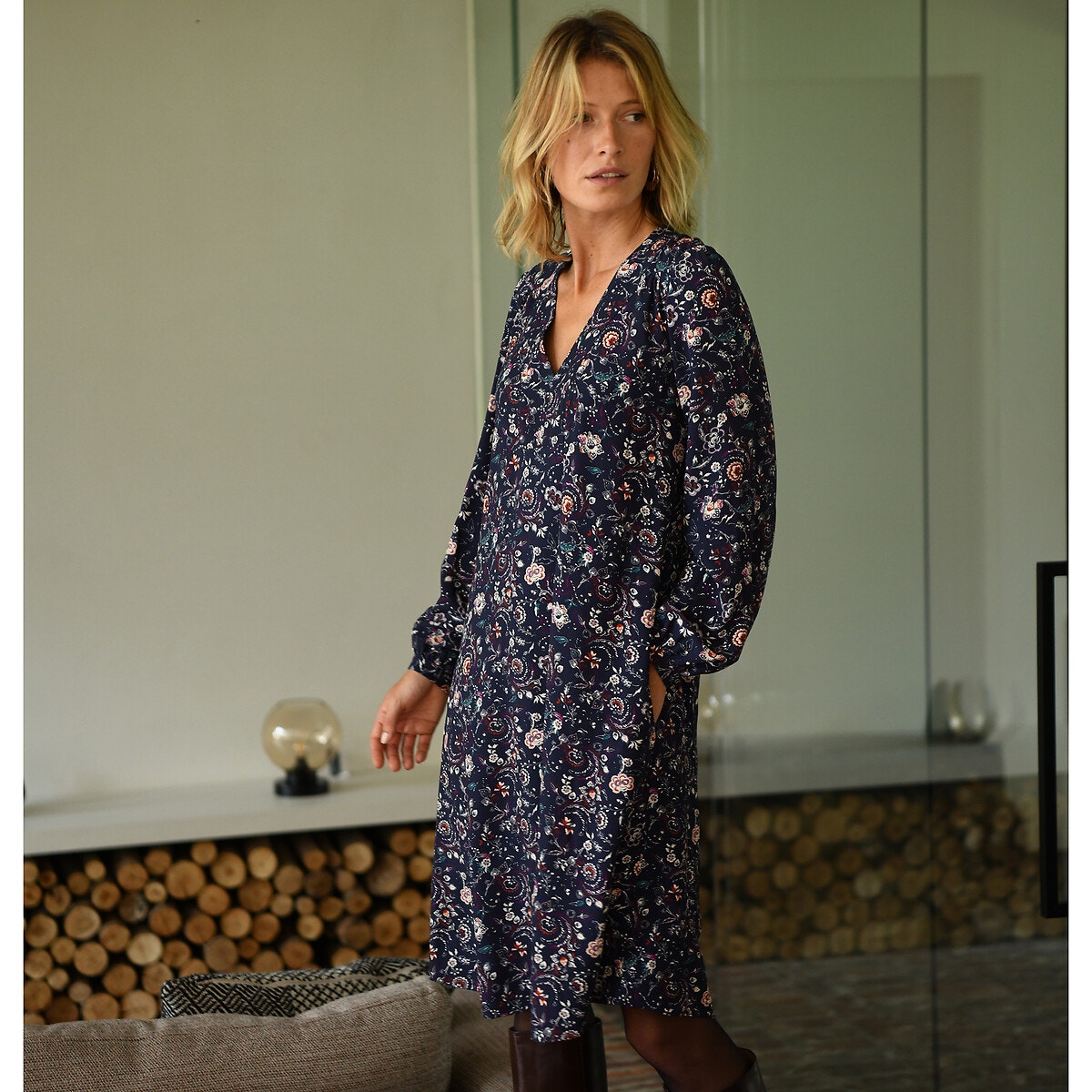 Χυτό ύφασμα και πολύ ευχάριστη αίσθηση για αυτό το εμπριμέ φόρεμα, ένα διαχρονικό κομμάτι στην καλοκαιρινή γκαρνταρόμπα σας. Λαιμόκοψη V. Μακριά μανίκια χωρίς φόδρα, βάση που σφίγγει, κλείνει με κουμπιά. Τσέπες στις πλαϊνές ραφές.