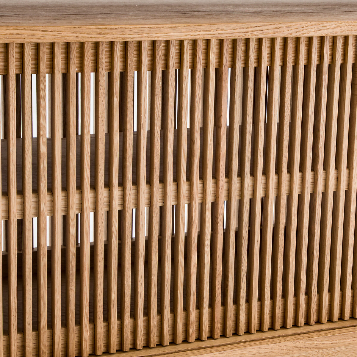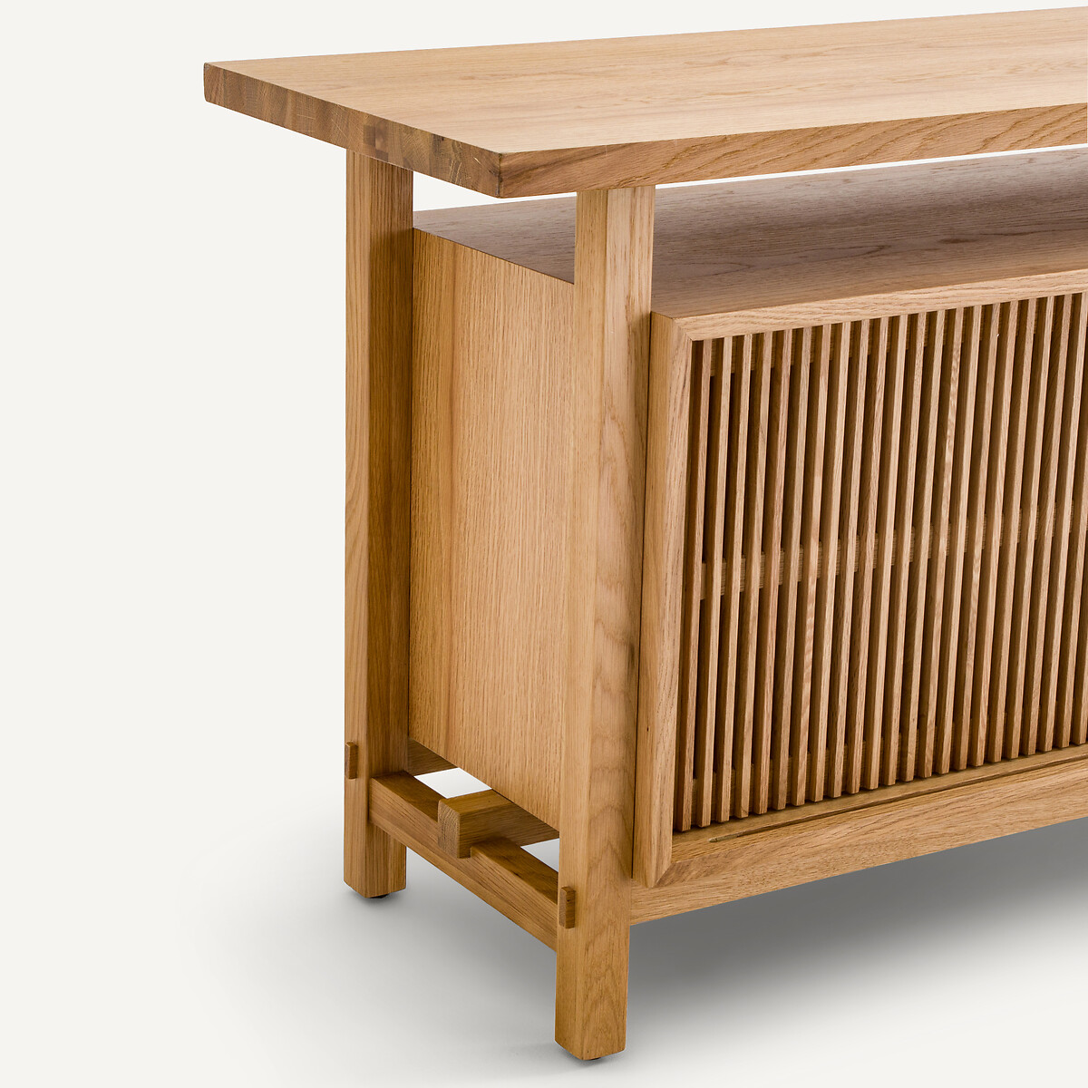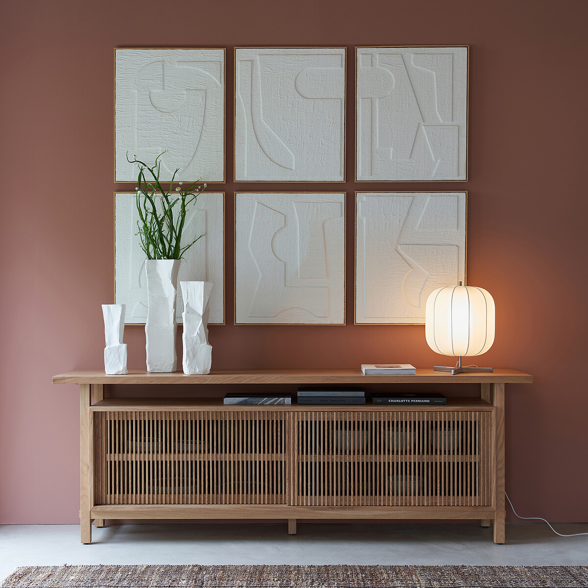 Ιαπωνική κουλτούρα. Αυτός ο μπουφές με μίνιμαλ ύφος έχει συρόμενες πόρτες και πλάτη με λεπτές κατακόρυφες τάβλες για να διατηρεί ανάλαφρη αίσθηση παρά τις XL διαστάσεις του.Οι συρόμενες πόρτες, η τραβέρσα κάτω από τη βάση και τα ρυθμιζόμενα ράφια του είναι σημαντικές λεπτομέρειες, ειδικά μελετημένους για να συνδυάζουν λειτουργικότητα και αισθητική. Μια δημιουργία της AM.PM.