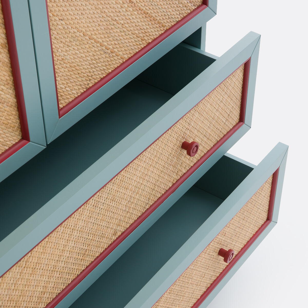 -  Πρόσοψη πορτών και συρταριών από πλεκτό ρατάν, πλαίσιο από βαμμένη φτελιά με ακρυλική βαφή