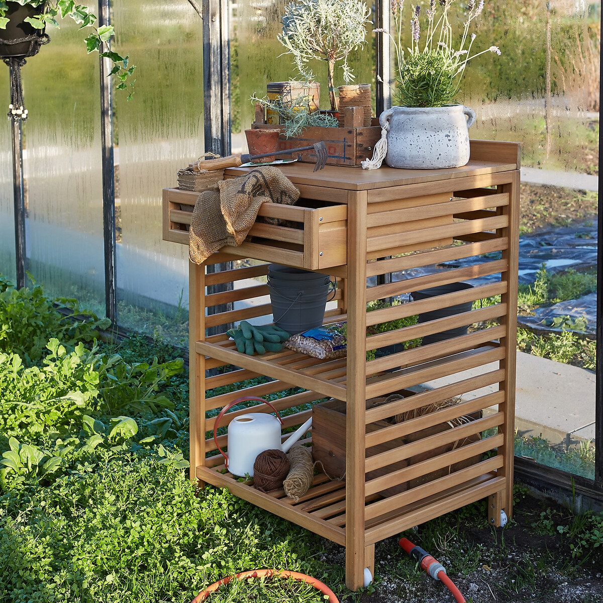 Με 2 ράφια και ένα συρτάρι, προσφέρει μια πρακτική λύση αποθήκευσης ενώ χάρη στα ροδάκια του, μεταφέρεται εύκολα στη βεράντα ή στον κήπο σας.