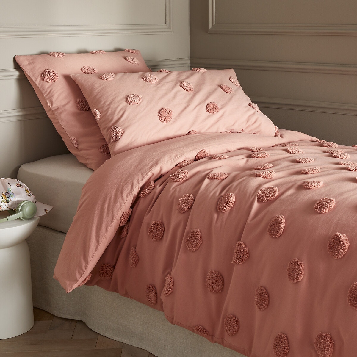 Η παπλωματοθήκη Kodoli είναι γεμάτη με απλικέ πουά που θυμίζουν φουντίτσες δεμένες στο χέρι. Από 100% οργανικό βαμβάκι, απαλό, υγιεινό και με ευχάριστη αίσθηση για το δέρμα των παιδιών σας.