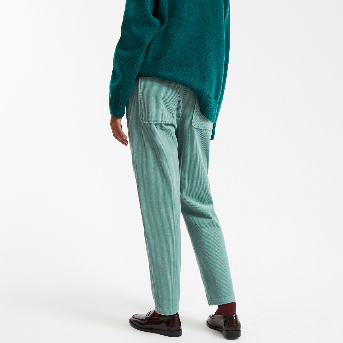 Ένα θηλυκό παντελόνι φτιαγμένο από βαμβακερό βελούδο με μεγάλες πλακέ τσέπες μπροστά. Σε ανδρόγυνο στυλ και γραμμή σιγκαρέτ.