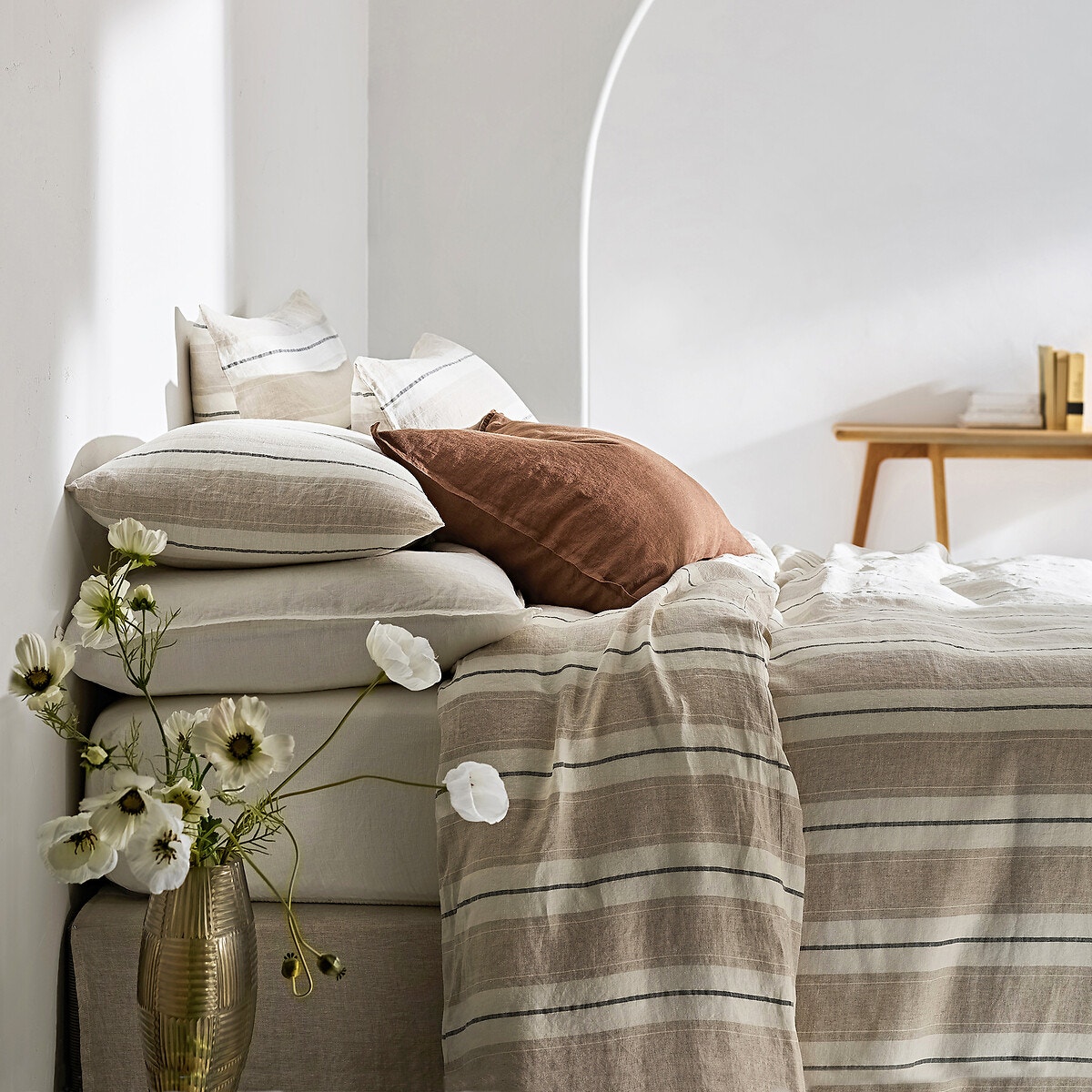 Τα λευκά είδη Makoun, διαχρονικά και κομψά, δίνουν ζωή στο υπνοδωμάτιο χάρη στο λινό ύφασμα νηματοβαφή με όμορφες ρίγες. Κατασκευάζονται στην Πορτογαλία.Μοναδικός συνδυασμός αυθεντικότητας, άνεσης και κομψότητας, το λινό έχει θερμορυθμιστικές ιδιότητες: είναι δροσερό το καλοκαίρι και ζεστό το χειμώνα... Καλλιεργείται στην Ευρώπη και έχει εύκολη συντήρηση, με ελαφρώς τσαλακωμένη όψη για να μην χρειάζεται σιδέρωμα. Προπλυμένο για απαλότητα και μοντέρνο στυλ, γίνεται ακόμη πιο όμορφο και απαλό με το πέρασμα του χρόνου!