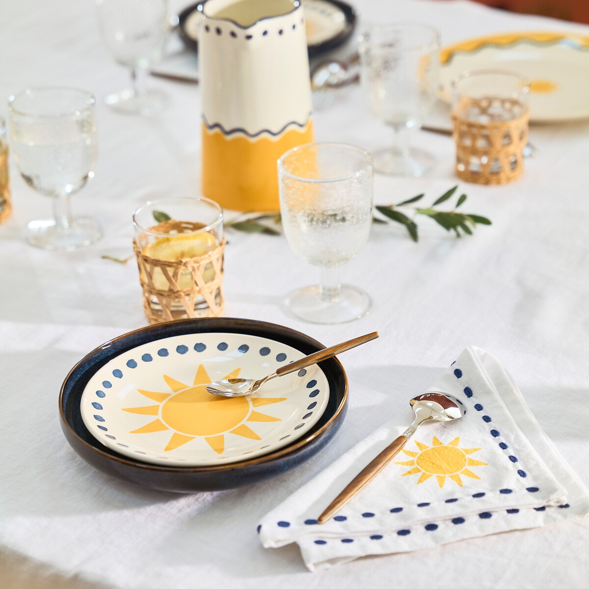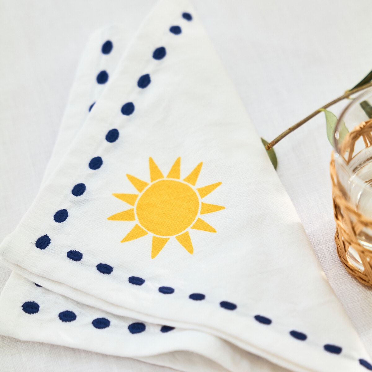 Η Μεσόγειος στο τραπέζι σας! Κέντημα και ένας ήλιος τυπωμένος σε βαμβακερό προπλυμένο ύφασμα. Μια δημιουργία της La Redoute Intérieurs.Το προπλυμένο βαμβάκι έχει υποστεί ελαφριά λεύκανση στη διαδικασία παραγωγής του. Απαλό, μαλακό και άνετο, ομορφαίνει με τα πλυσίματα. Πολύ μοντέρνο, με ελαφρώς γκοφρέ όψη και εύκολη συντήρηση αφού δεν χρειάζεται σιδέρωμα.
