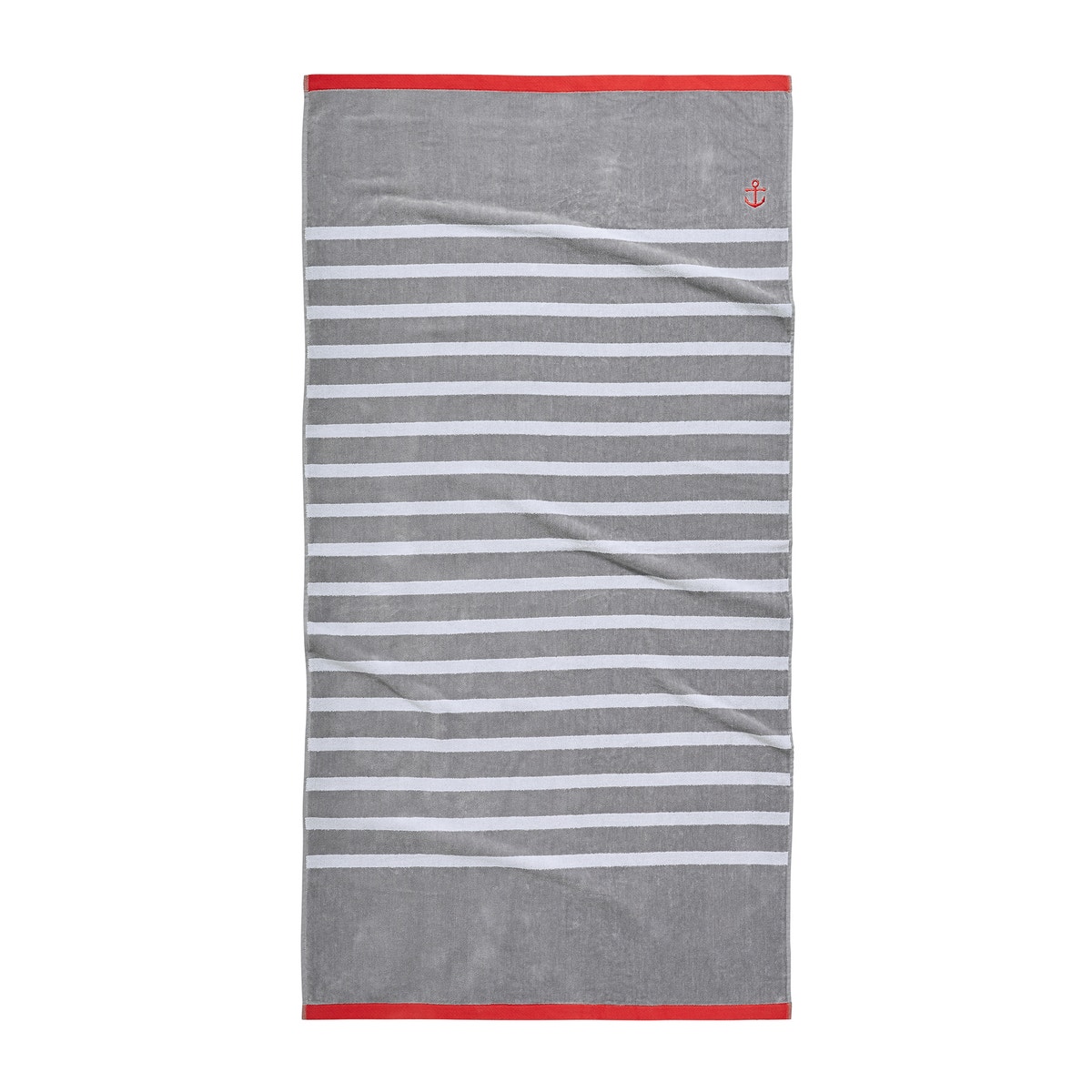 Σε ναυτικό στυλ. Με έντονες κόκκινες και λευκές ρίγες! Με κέντημα ’’άγκυρα’’. Ύψηλή ποιότητα και απορροφητικότητα: 1 πλευρά πετσετέ βελούδο, 1 πλευρά μπουκλέ. Υφάσμα: ζακάρ από 100% βαμβάκι, 500 γρ./μ2. Μέγεθος: 90 x 175 εκ.