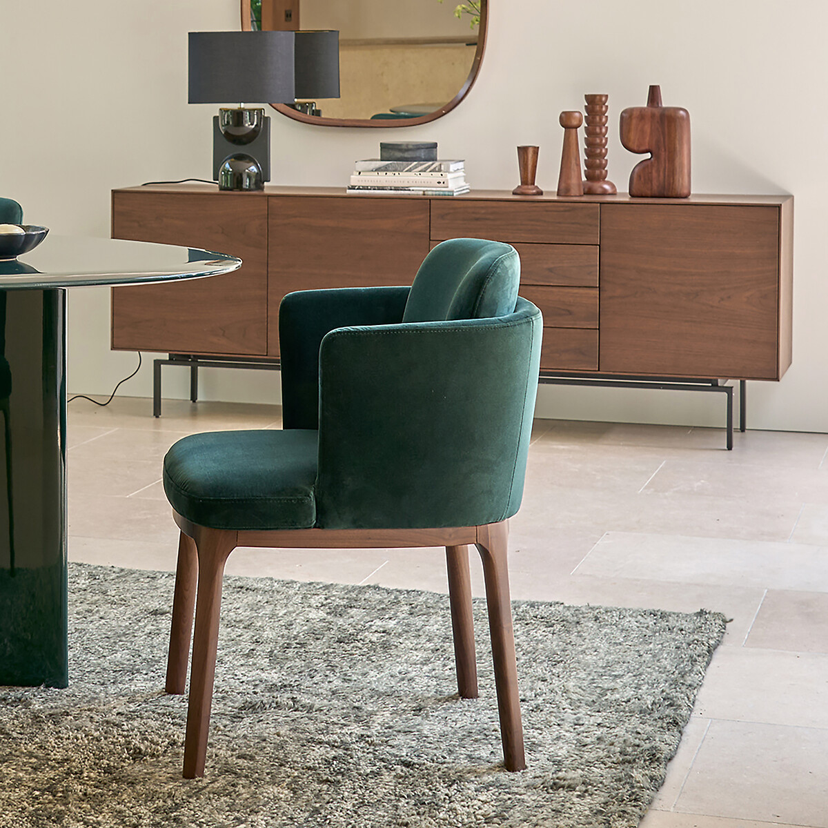 Πολυθρόνα τραπεζαρίας από ξύλο καρυδιάς με βελούδινη ταπετσαρία Jabote