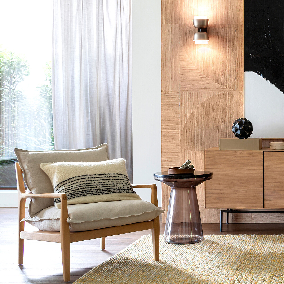 Η πολυθρόνα Dilma ξεχωρίζει για την απλότητα της γραμμής και την κατασκευή της από μασίφ ξύλο δρυ FSC®. Θυμίζει τα έπιπλα σκανδιναβικού ντιζάιν της δεκαετίας του 50, με τα σμιλεμένα μπράτσα και τις στρογγυλεμένες γωνίες της. Η ελαφριά κλίση της πλάτης και τα αφράτα μαξιλάρια με ταπετσαρία από λινό δίνουν σε αυτή την πολυθρόνα ιδιαίτερη άνεση. Μια δημιουργία με την υπογραφή της AM.PM.