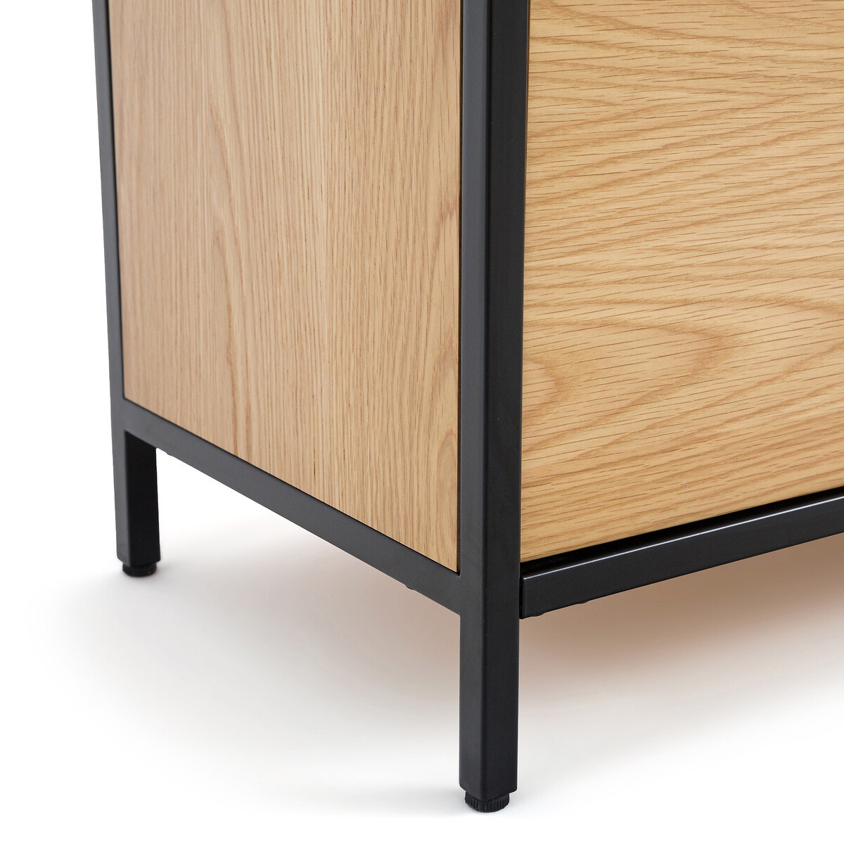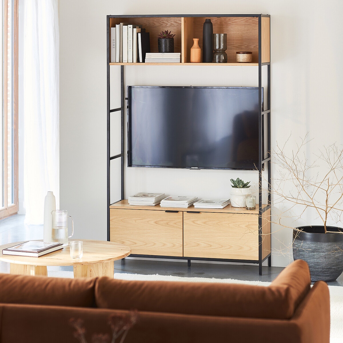 Ίσιες και λιτές γραμμές. Επιφάνεια από καπλαμά ανοιχτόχρωμου ξύλου δρυ. Μαύρα πόδια από σίδηρο. Το έπιπλο TV/Hifi Volga μπορεί να φιλοξενήσει τα βιβλία, τα διακοσμητικά σας αντικείμενα και μία τηλεόραση μέχρι 50 ιντσών.Συνδυάστε το με τις ραφιέρες της συλλογής και δημιουργήστε μια όμορφη σύνθεση για τον τοίχο σας. Πρακτικό, το κλειστό ντουλάπι έχει μια τρύπα για τα καλώδια στο πίσω μέρος για να προστατεύει τις συνδέσεις σας.