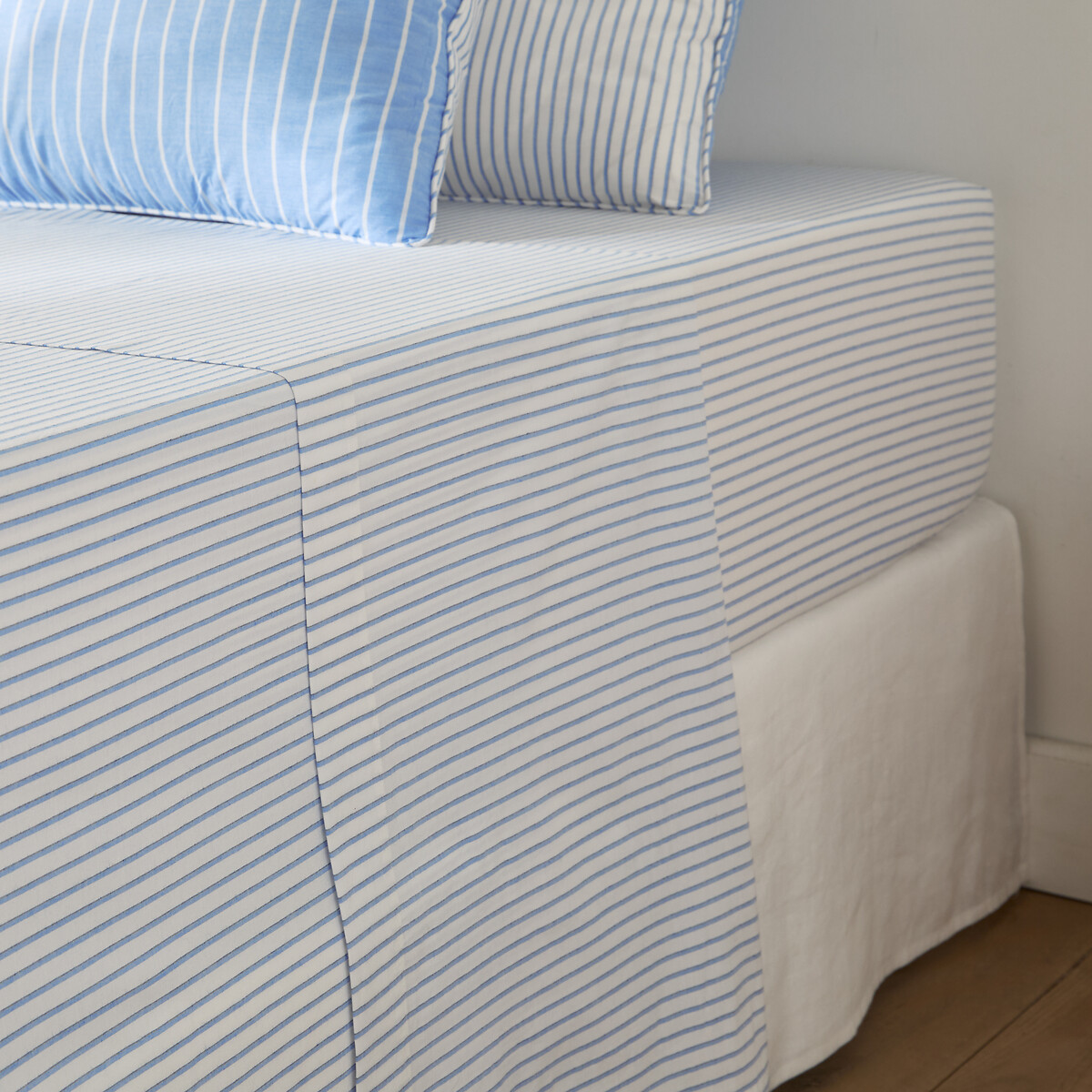 Ένας κόσμος σύγχρονων γραμμών και επαναλαμβανόμενων ρυθμών αποκαλύπτεται σε μπλε και λευκό, πάνω στο σεντόνι Edward, από βαμβακερό περκάλι με ρίγες. Μια δημιουργία της σειράς La Redoute Interieurs. Το βαμβακερό περκάλι προσφέρει μια ευχάριστη αίσθηση δροσιάς και ελαφρότητας. Το σφιχτό ύφαντό του το καθιστά εξαιρετικά απαλό, προσφέροντας premium άνεση. Ένα λείο και ματ υλικό που αποκτά επιπλέον μαλακότητα με το πέρασμα του χρόνου και τις επαναλαμβανόμενες πλύσεις.