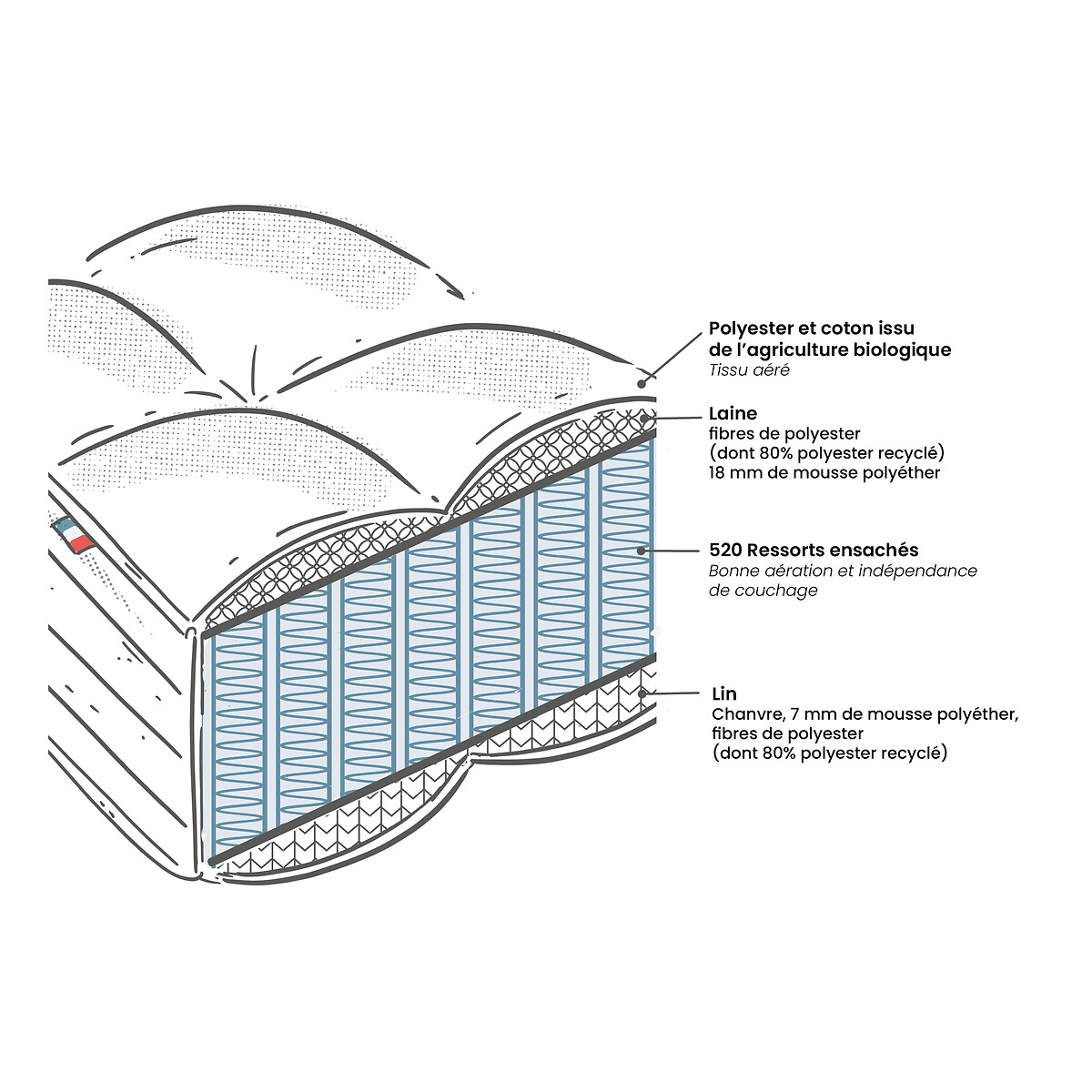 - Καλοκαιρινή πλευρά: λινό και κάνναβη (150 g/m²) + υποαλλεργικές ίνες (150 g/m²) + μους άνεσης 7mm