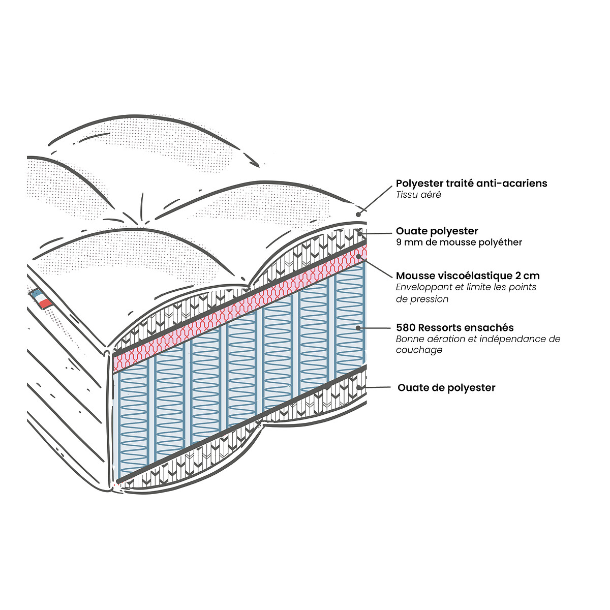 Μια αληθινή αγκαλιά για το σώμα σας χάρη στην κατασκευή του με πολλαπλές τεχνολογίες: πυρήνας από αφρό μνήμης για μαλακή αίσθηση και ανεξάρτητα ελατήρια που εξασφαλίζουν ανεξαρτησία στον ύπνο.
