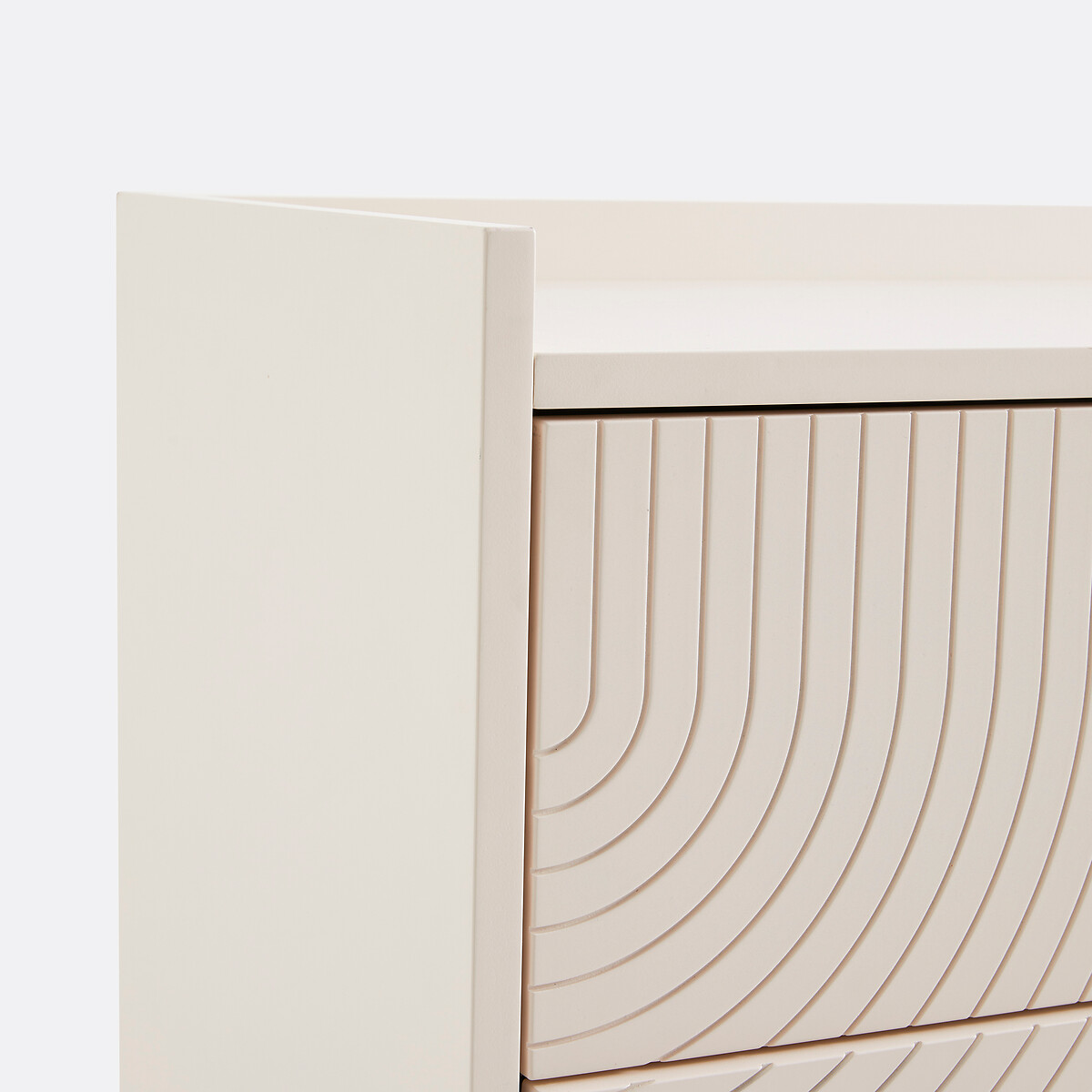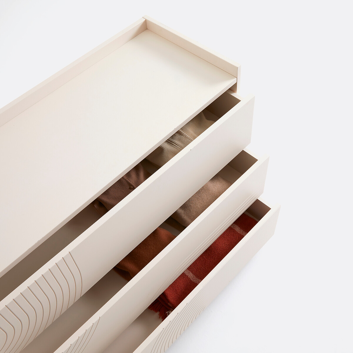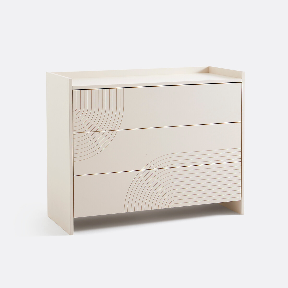 Γραμμές με μινιμαλιστικό design, ανάγλυφες λεπτομέρειες και λακαρισμένο ανοιχτόχρωμο ξύλο: αυτή είναι η συρταριέρα Newxor. Διαθέτει 3 μεγάλα συρτάρια και 1 ράφι αποθήκευσης στο επάνω μέρος. Μια δημιουργία της La Redoute Interieurs.