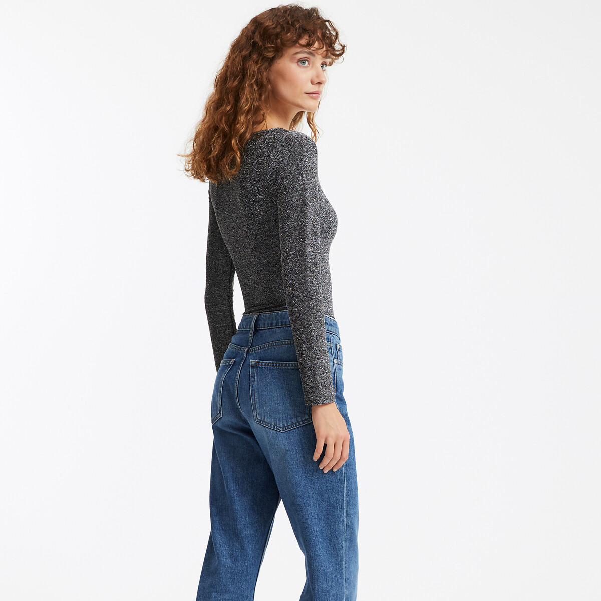 Στρετς ύφασμα σε ασημί απόχρωση και μεταλλιζέ όψη για αυτό το μακρυμάνικο κορμάκι με μεγάλο ντεκολτέ χαμόγελο και εκλεπτυσμένο στυλ.