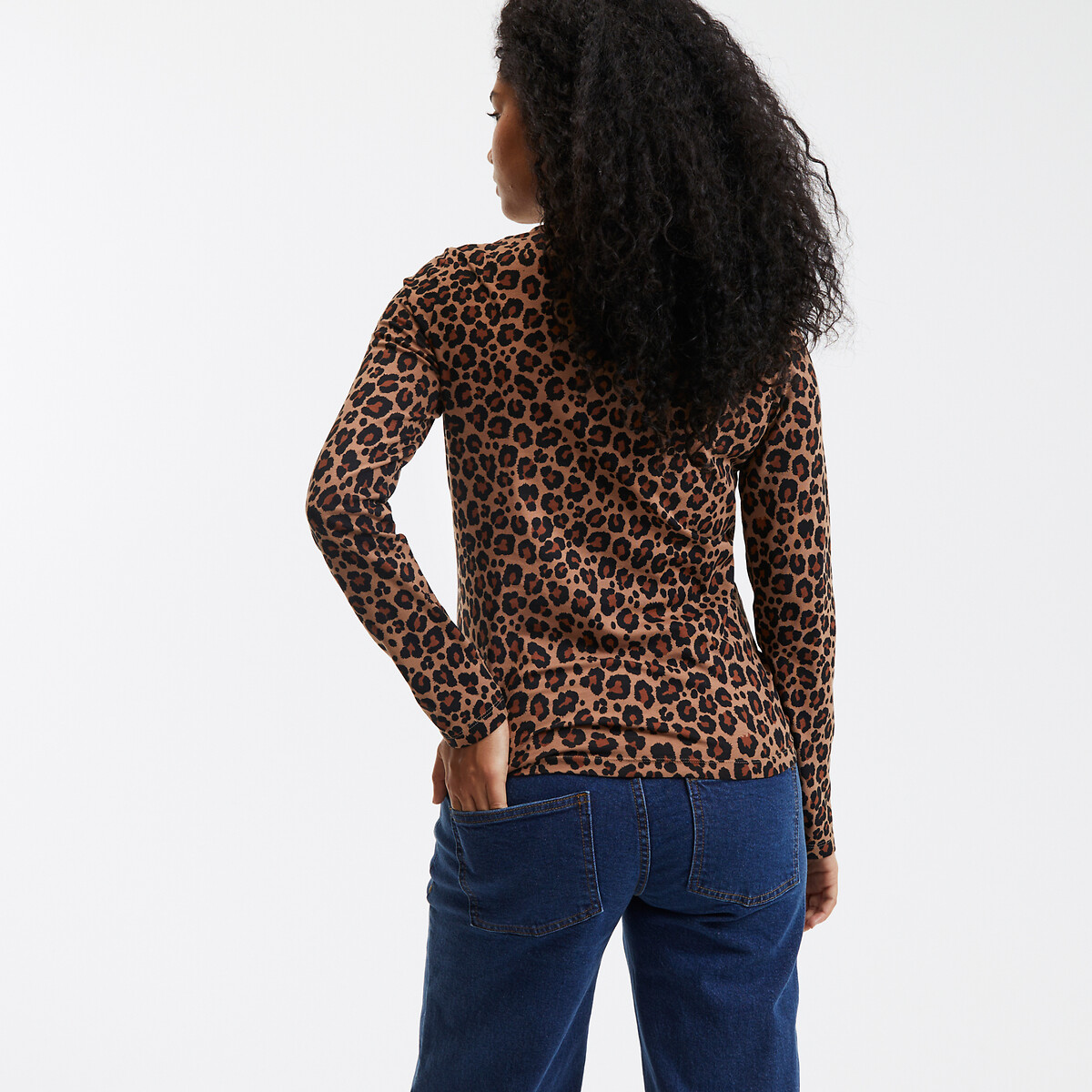 Εφαρμοστή γραμμή και λεοπάρ μοτίβο για αυτή τη μακρυμάνικη μπλούζα με λαιμό ζιβάγκο, από βαμβακερό ζέρσεϊ. Λεπτό βαμβακερό ύφασμα με πολύ ευχάριστη αίσθηση.