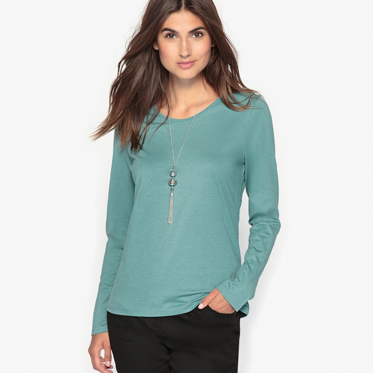 Μπλούζα με στρογγυλή λαιμόκοψη και μικρό σχέδιο στο εσωτερικό για πολλές επιλογές. Μακριά μανίκια. Συνδυασμός από φυσικό βαμβάκι με την μεταξένια απαλότητα του μοντάλ.