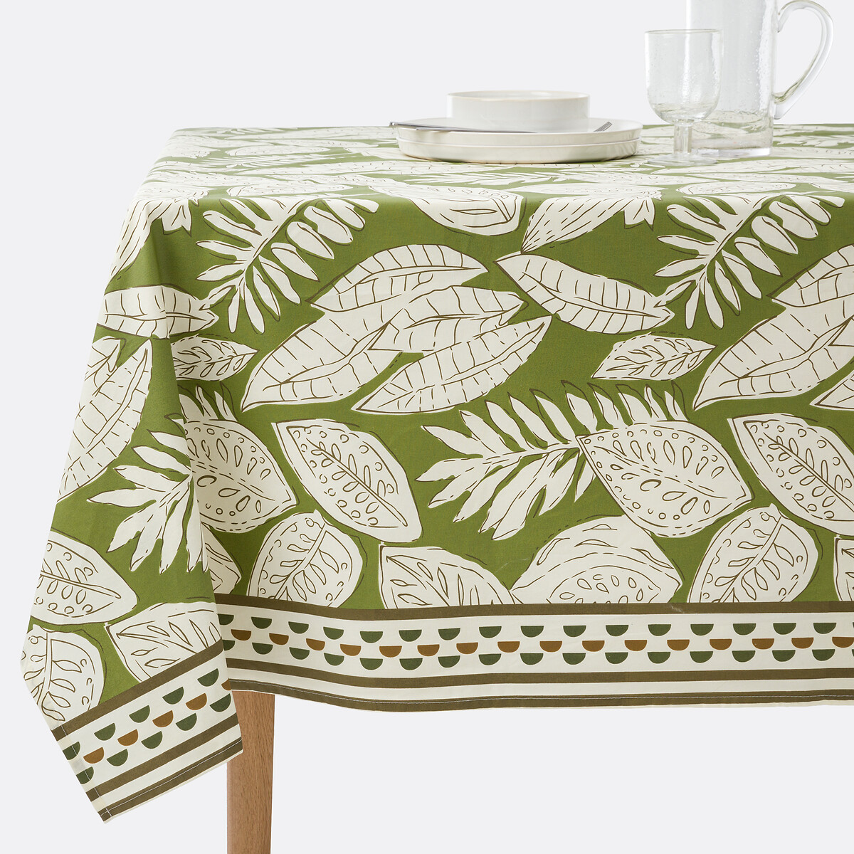 Εμπριμέ μοτίβο φύλλα και βαμβακερό ύφασμα με επεξεργασία κατά των λεκέδων... το τραπεζομάντηλο Lodja συνδυάζει απλότητα και κομψότητα. Χρηστικό και όμορφο. Μια δημιουργία με την υπογραφή της La Redoute Intérieurs.