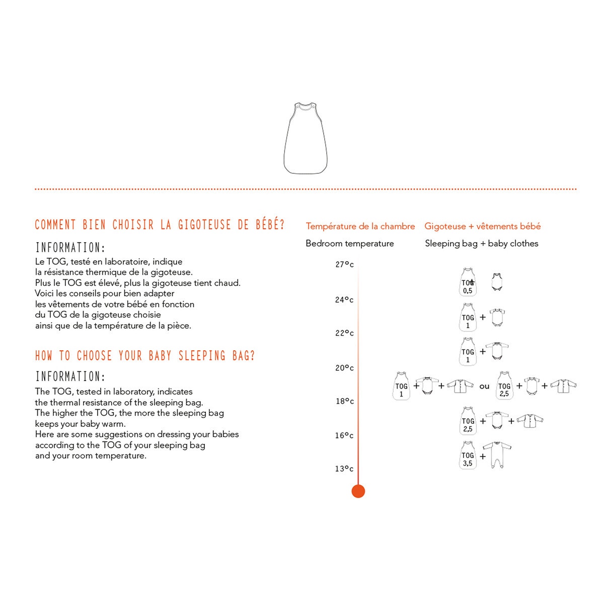Οι υπνόσακοί μας ανταποκρίνονται επομένως στις απαιτήσεις αυτού του νέου προτύπου, και θα παρατηρήσετε ότι τα φάρδη στη λαιμόκοψη είναι πλέον μικρότερα και το πάχος του γεμίσματος έχει μικρότερη σημασία. - Ο δείκτης θερμότητας (TOG) από το 1 έως το 10, εργαστηριακά δοκιμασμένος, δείχνει τη θερμική αντίσταση του υπνόσακου. Όσο υψηλότερος είναι ο δείκτης θερμότητας (TOG), τόσο πιο ζεστός είναι ο υπνόσακος.